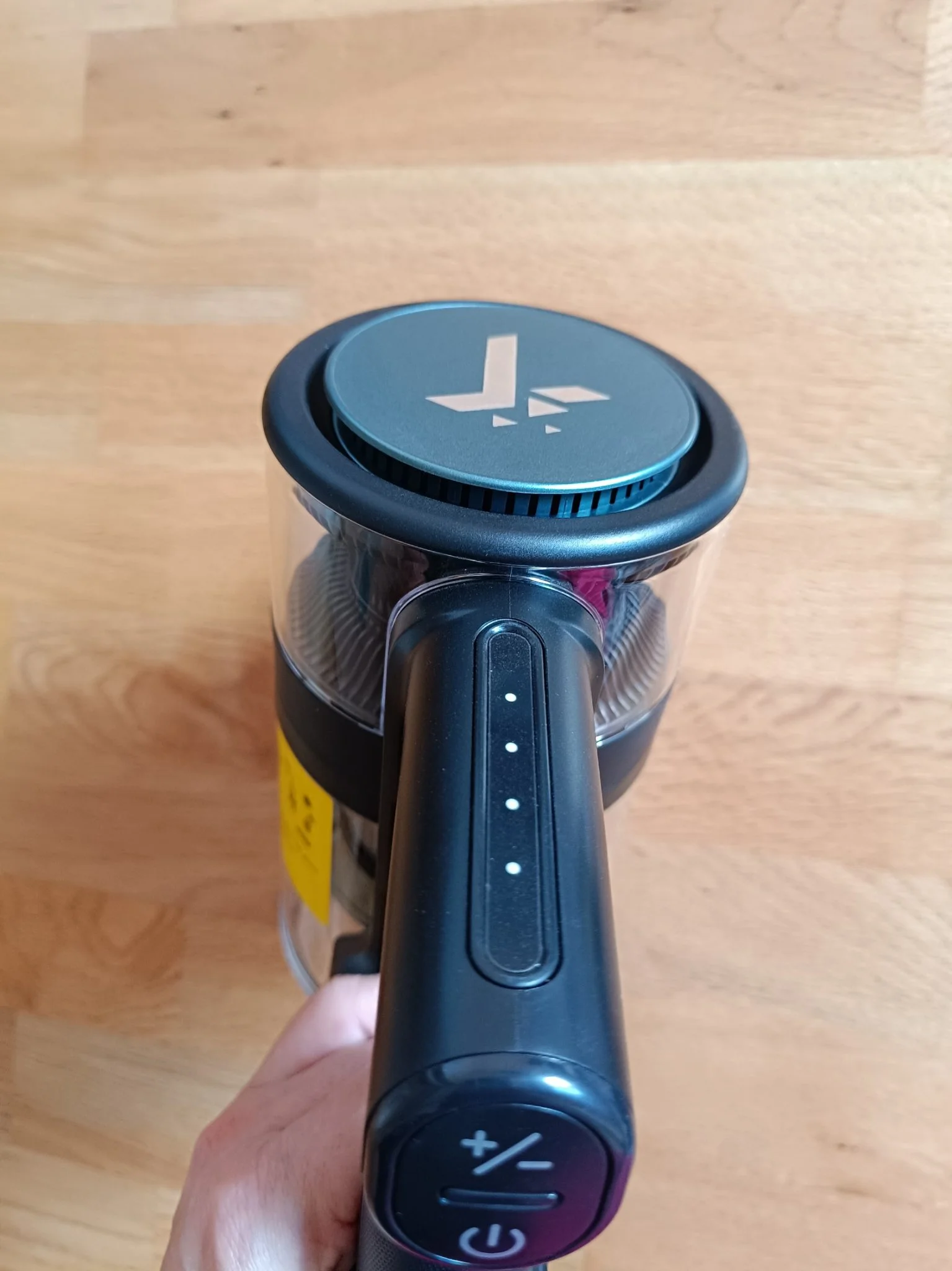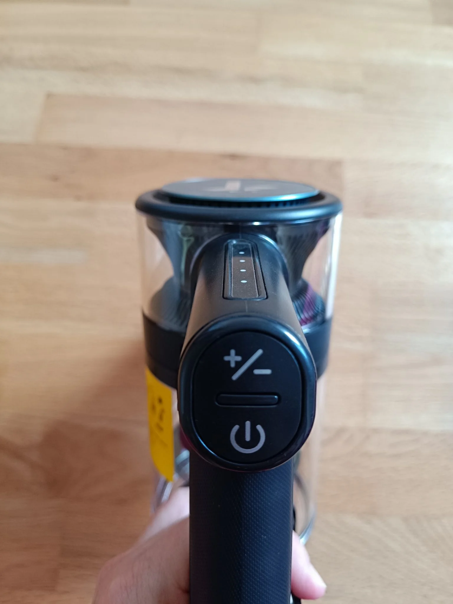 A kézi egységet nem gondolták túl, van rajta egy power gomb, valamint a +/- gombot megnyomva lehet váltani a két fokozat között. A töltöttségi szintet a kék pöttyök jelzik, így meg lehet saccolni, mennyi időnk van még házimunkázni. Értelemszerűen, ha 4 kék pontocska világít, akkor homlok megtöröl, korona megigazít és irány a szőnyegek! Ha már csak egy pontot látunk, akkor gyorsan el is éri a végelgyengülést a 2200 mAh-s aksi. Arról, hogy mennyit bír, van egy kis kuszaság a terméklap, a hivatalos képek és a gyártó oldalán feltüntetett adatok között. Szerepel 30, 35 és 50 perc is: vagy kreatív Tippmix Teendow-módra vagy nem csupán a port szívta fel valaki a gyártónál. Mivel nem mindegy, hogy 12 m2-es sufni vagy teljes lakás takarításához szeretnénk használni, lemértem.