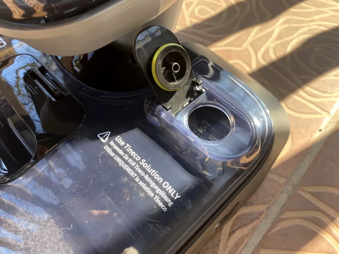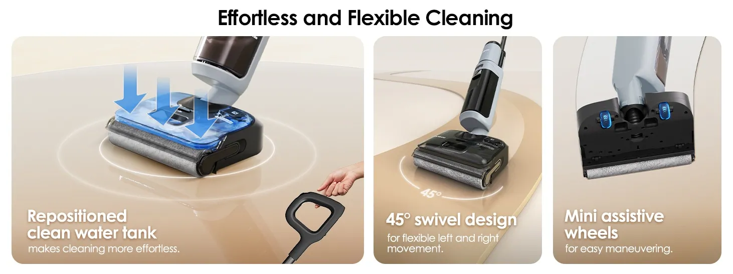 A tiszta vizes tartályt közvetlenül a szívófej fölé helyezte, tehát nem a felhasználó kezére nehezedik ez a nyomás, ráadásul így szinte magától siklik a porszívó a padlón, de a finom mozdulatokban a fej alján lévő, két kis görgő szintén segít. A fej csatlakoztatása is egészen rugalmas, mert oldalirányba 45 fokban elforgatható, így a székek lábai között is könnyebb vele szlalomozni. Bár a gép nehéznek tűnhet, de ezeknek az „apróságoknak” köszönhetően használat közben meglepően könnyűnek érződik.