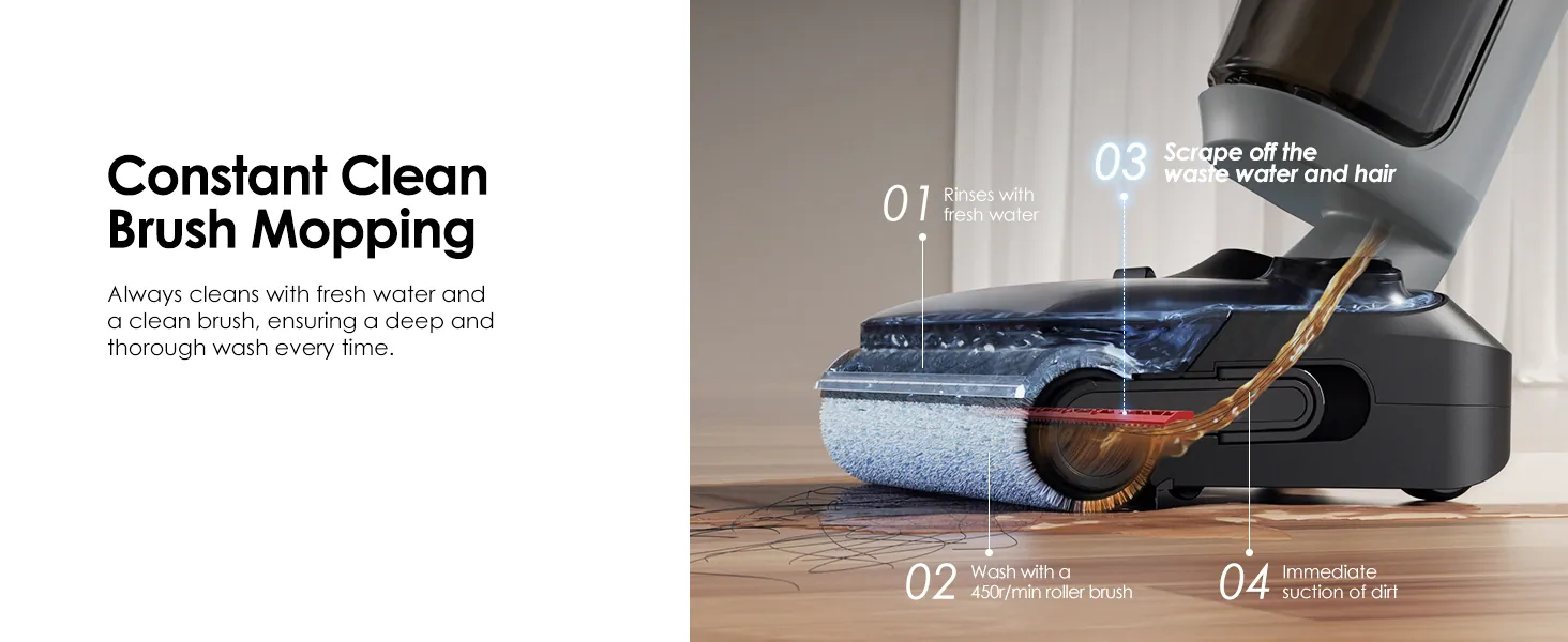 A hengerkefe percenként 450 fordulatra képes és takarítás közben folyamatosan „megújul”, tehát itt permanens öntisztításról van szó. A tiszta vizes tartályból, ami 800 milliliter űrtartalmú a rendszer folyamatosan adagolja a vizet és a tisztítószert, közvetlenül a hengerkefére, így az nem szárazon súrolja a padlót, aminek nem sok értelme lenne. A nagy sebességgel forgó, puha henger fellazítja az odaszáradt koszt és felszívja a kiömlött folyadékot, a hengerre rásimuló alkatrész, pontosabban „lehúzó él” pedig szó szerint kipréseli és leborotválja a hengerről a hajszálakat és szilárd szennyeződéseket. Végezetül az összes lehúzott trutyit a gép azonnal beszippantja és a koszos víz tartályába továbbítja, ami 720 milliliteres.