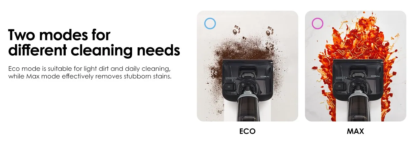Az i5 Stretch kétféle móddal rendelkezik: Eco és Max. Szerintem az elnevezésekből egyértelmű, hogy az előbbi a könnyed koszhoz és a mindennapi takarításhoz való, míg az utóbbi a komoly mocsokhoz és balesetekhez. Bár hiányolhatnád a „vízszívó” üzemmódot, ami például egy fürdés/zuhanyzás után jól jönne, de a Max fokozat és a 20 000 Pa simán elintézik azt is.