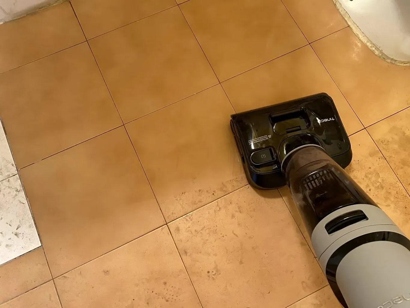 ahogy a legtöbb száraz-nedves porszívónál lenni szokott. Bár a Tineco az egyik legügyesebb abban, hogy a hengerkefe szélét kihúzza a burkolat széléig, a meghajtásához szükséges mechanika és a burkolat vastagsága miatt mindig marad egy kis „holt tér”: egy vékony, érintetlen, koszos sáv a szegélylécek mentén. Ilyenkor érdemes megpróbálni a porszívó másik oldalával odaférkőzni, de 100%-os tisztaságra senki se számítson.