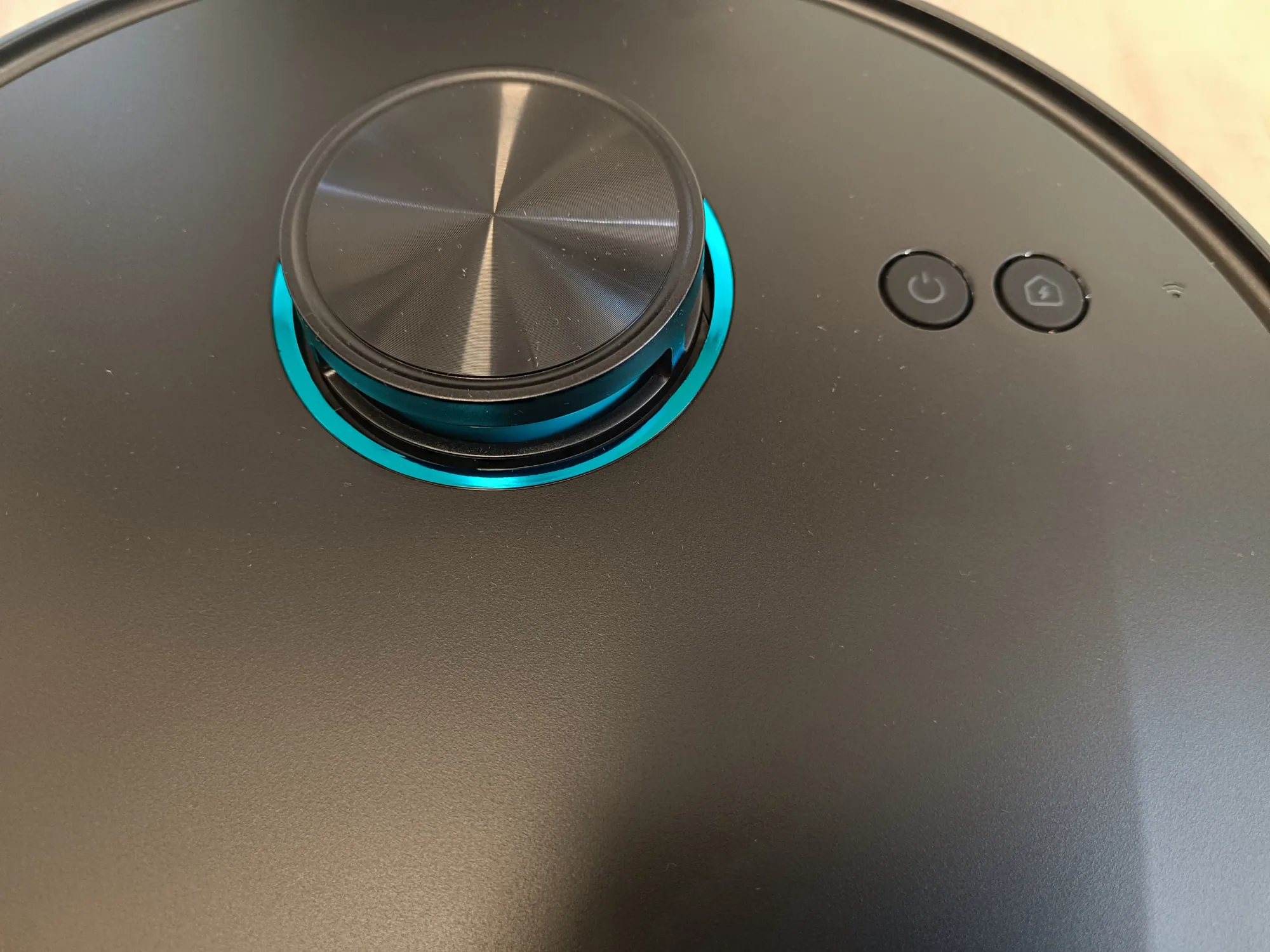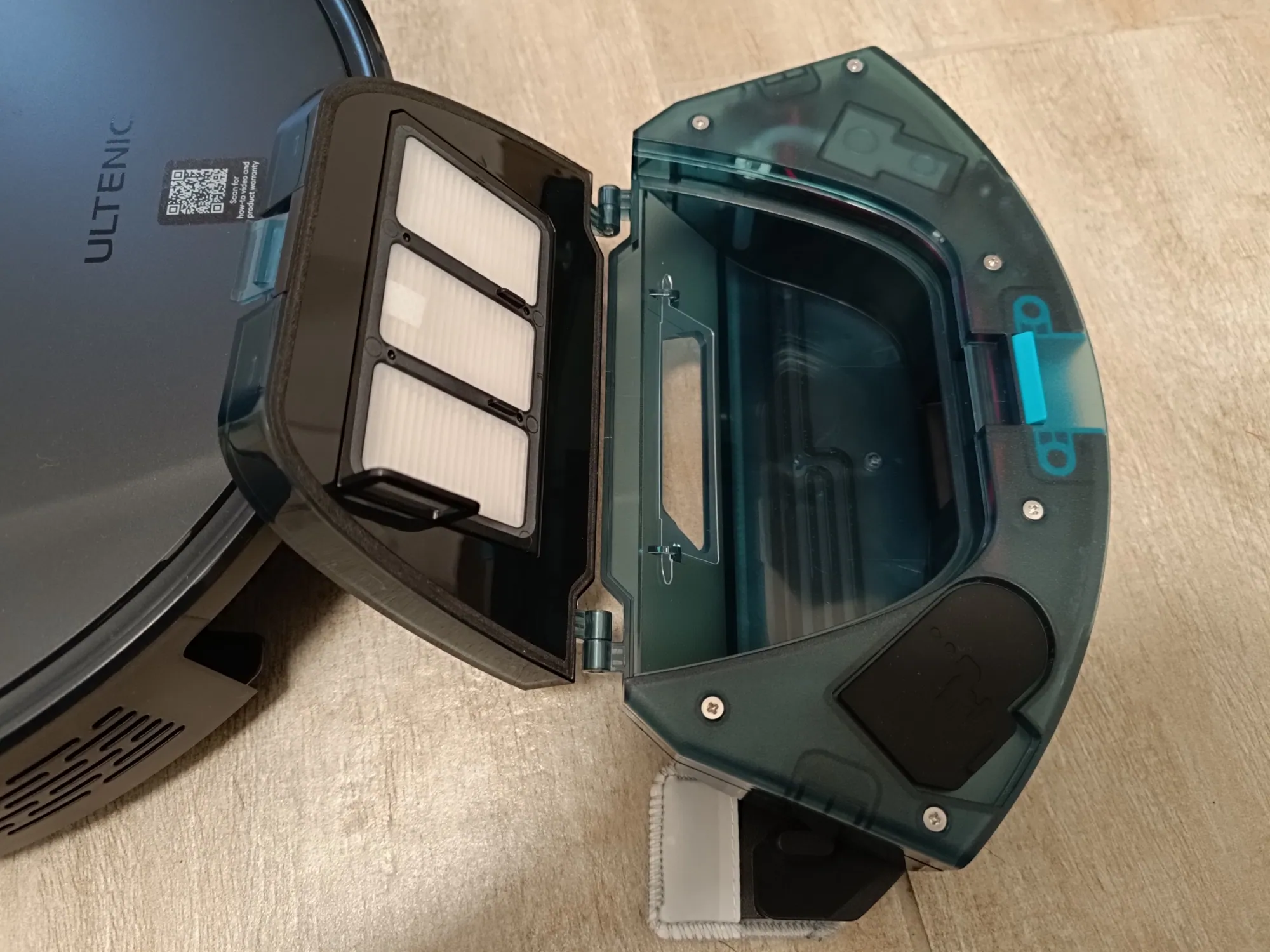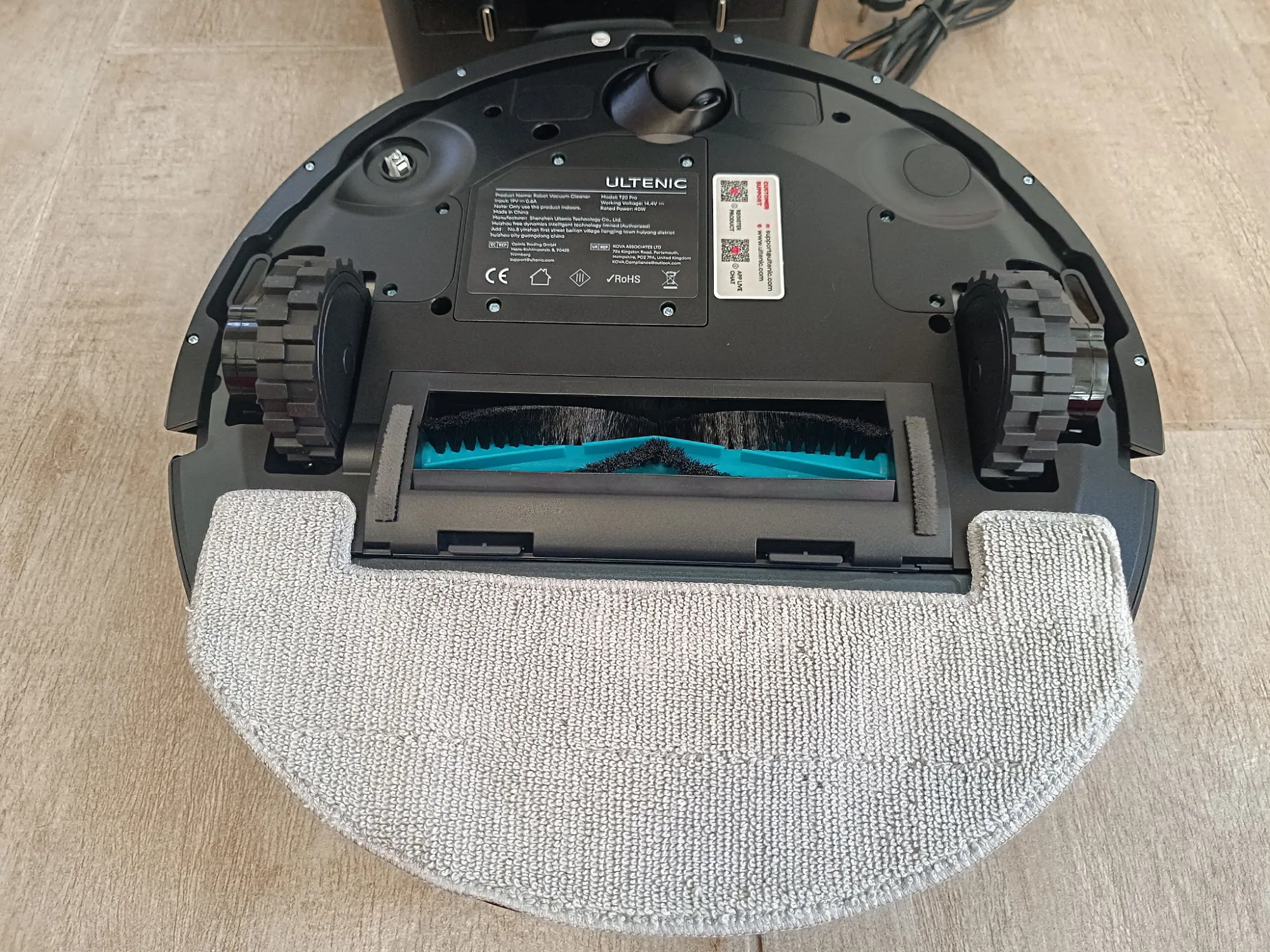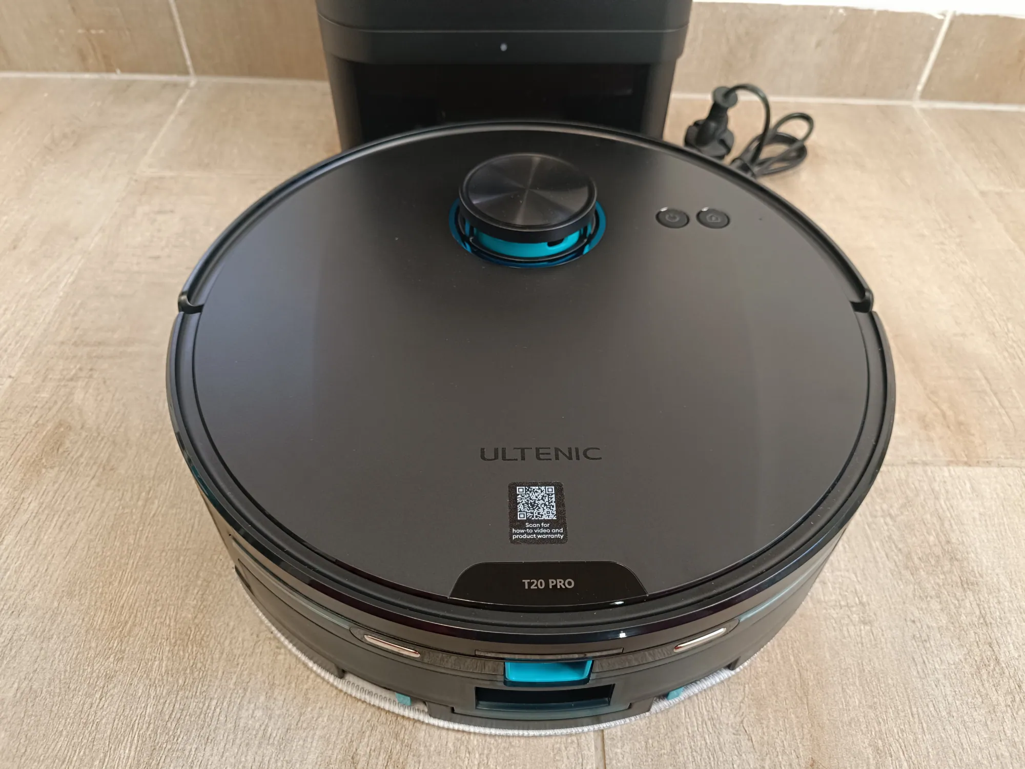 ráadásul a dokkolóállomás sem foglalja el a fél konyhát (itt kapott végül helyet) – bátran használhatják kisebb lakásban élők is, olyan kis diszkrét. A robot tetején találjuk a LiDAR szenzort, valamint két gombot: egyet a be- és kikapcsoláshoz, egy pedig a „hazahívó”, amellyel applikáció nélkül visszaküldhetjük az Ultenicet a helyére. A robotporszívó oldalára került egy érzékelő, amit akadályelkerüléshez használ a gép, valamint itt tudjuk a portartályt is kihúzni, ami egyben a víztartály is, alul pedig a mop, a hengerkefe, az oldalkefe és egy leesésgátló szenzor van. És most, hogy így szépen szemrevételeztük, fogjuk is munkára.