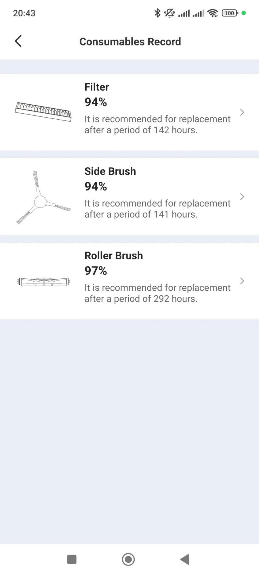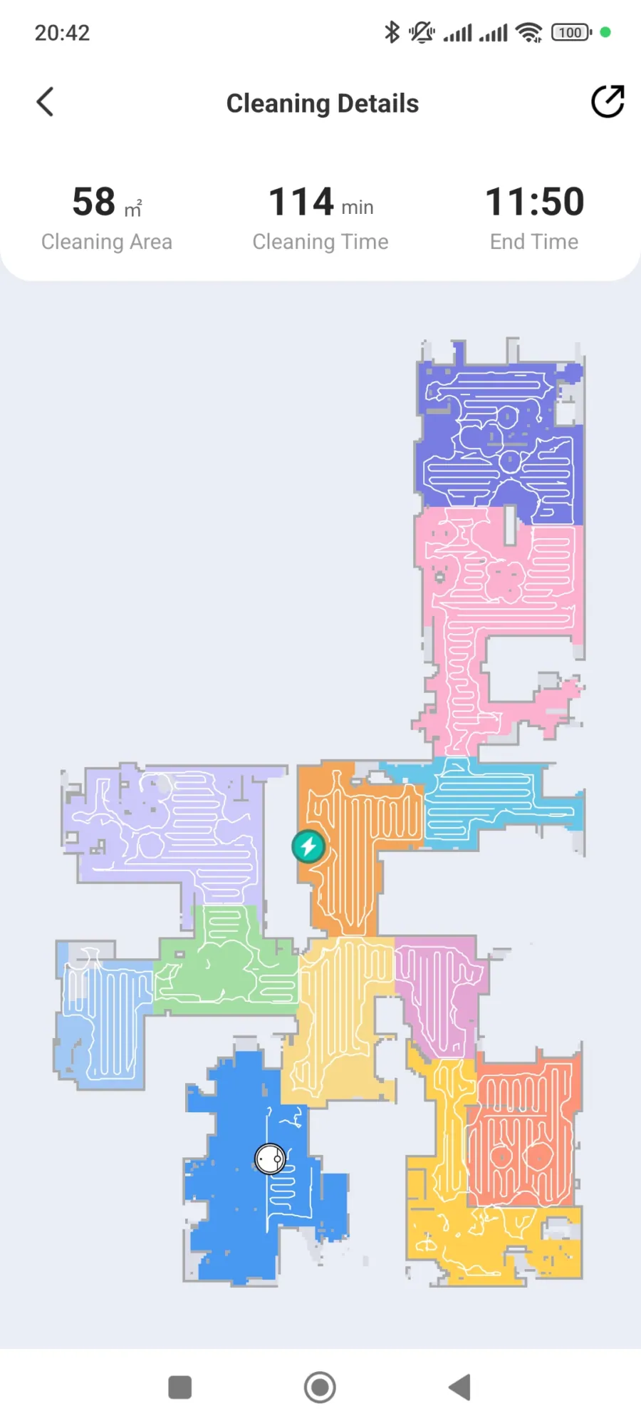 de ezzel több bajom is van. Egyrészt nem tudom, hogy jött ki neki ez a területnagyság, még akkor sem, ha a feltérképezés nem sikerült neki normálisan. Másrészt a 114. perc végére már lemerülőben volt a drága, pedig még végig sem ért a lakáson, ergo a beígért 200 négyzetmétert avagy 180 perces (máshol 2 óra 30 perces – nem megy a matek, na 😅) üzemidőt közel sem képes hozni, legalábbis automata üzemmódban biztosan nem. Amikor a robot töltöttségi szintje elérte a 18%-ot, éppen a hosszú szálú szőnyegünket kísérelte meg tisztává varázsolni, de ahogyan észlelte, hogy merül, közölte, hogy akkor ő most szépen visszaballag a helyére kicsit töltekezni. Ezzel nem is lenne gond, hiszen a gyártó szerint is így kellene lennie, azonban