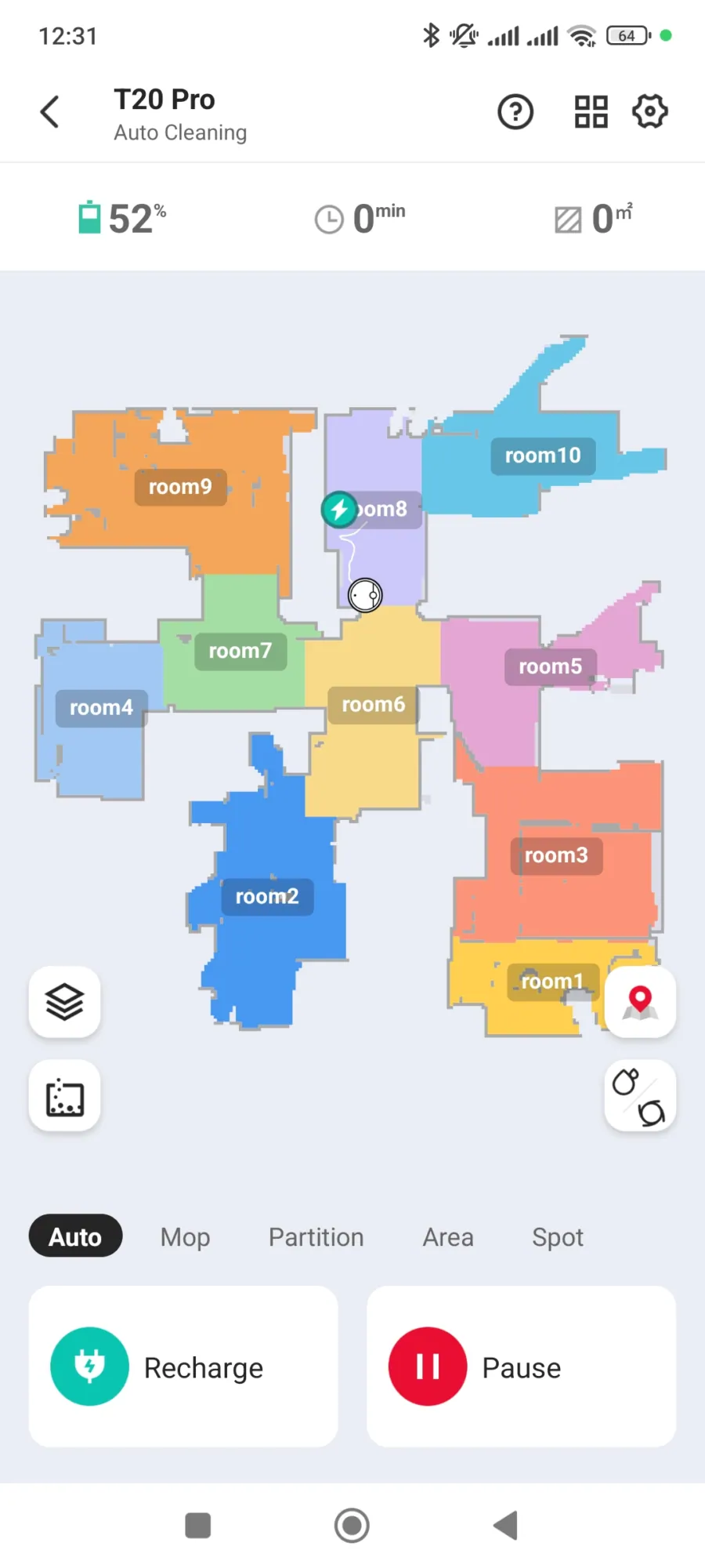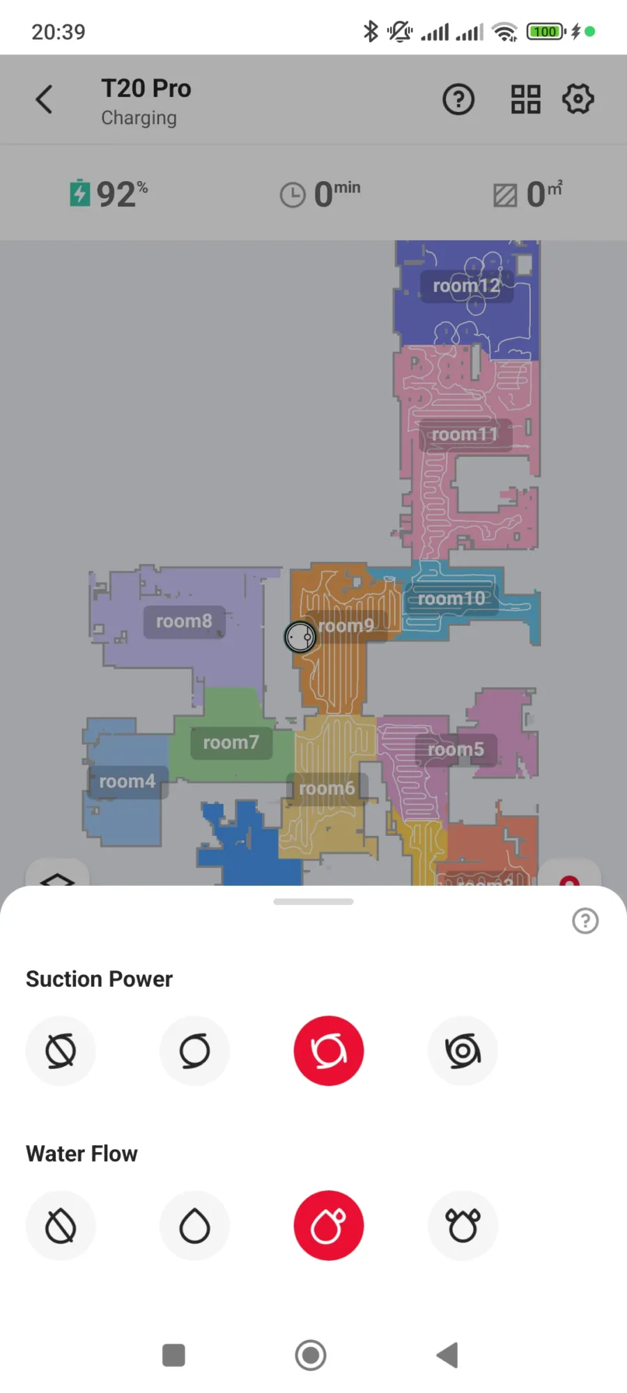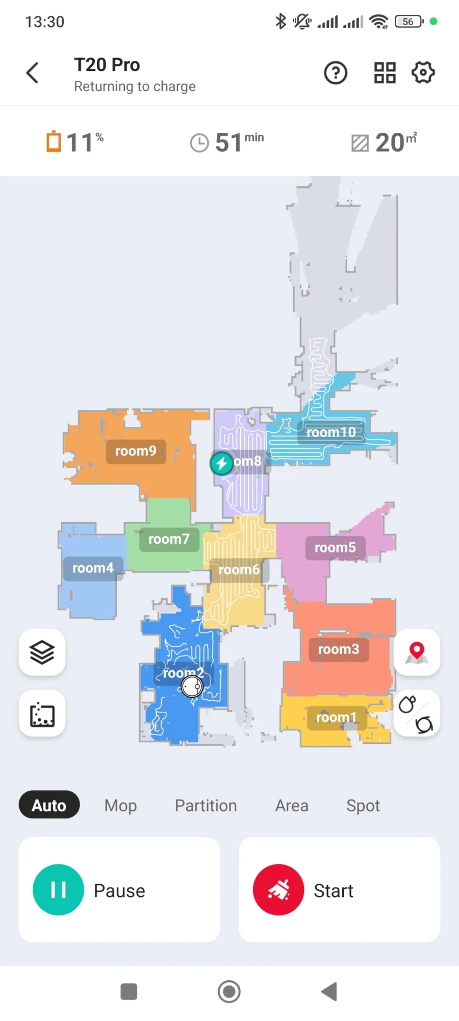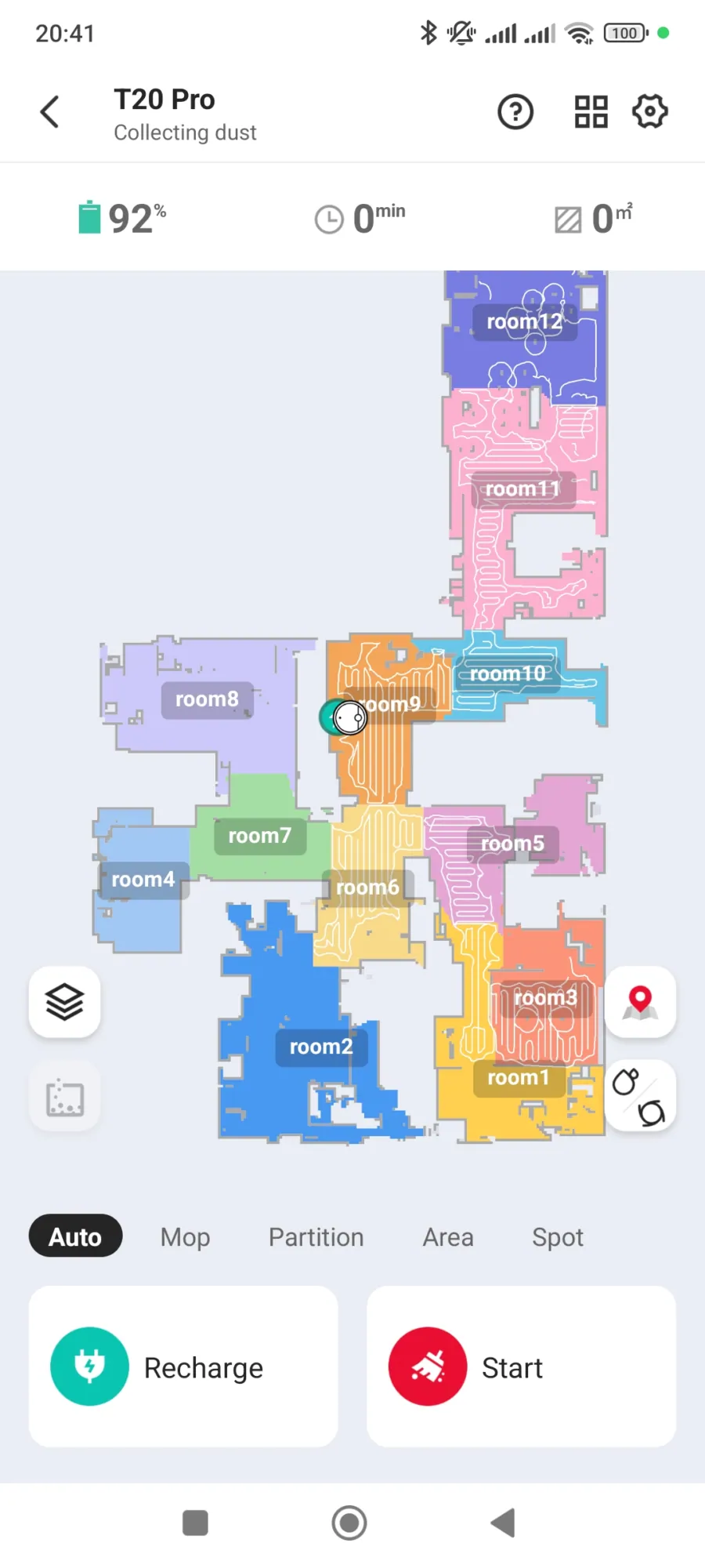 A robotporszívó szerint összesen 12 helyiségünk van, hogy egy kollégámat idézzem ezzel kapcsolatban: „Ti kastélyban laktok?”. Nem, nem lakunk palotában és a helyiségek száma a valóságban 8. A feltérképezés első körében 10 szobát számolt össze a T20 Pro és volt olyan is, amit ignorált, mintha nem is létezne. Miután még egyszer nekifutottunk a feladatnak, akkor jött ki neki a 12 helyiség. Egy-egy szobát például kettőnek vett, ami érthetetlen, mivel nincs benne semmi olyan objektum (például térelválasztó), ami megzavarhatta volna a felmérést. Az applikációban egyébként 5 szintet is tud kezelni, de ezt a robotporszívók többsége tudja.