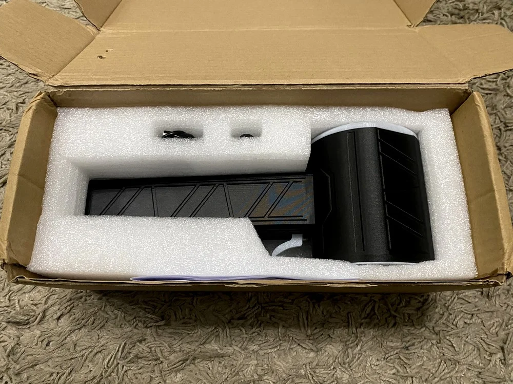 A legnagyobb meglepetés akkor ért, amikor kicsomagoltam a kütyüt, ami a világ legunalmasabb és leggyengébb, barna kartondobozában érkezett, amin még a töltőadapter is kifogott. A következő galéria végén látni fogod, hogy ez pontosan mit takar. A csomagot kinyitva egy körülbelül akkora légfúvóval találtam magamat szemben, mint egy hajszárító, hiszen a tesztalany 28x10x9,5 centiméter nagyságú. A képek erejéig mellétettem egy öngyújtót, mert így a méretkülönbségek mindenkinek egyértelműek lesznek.