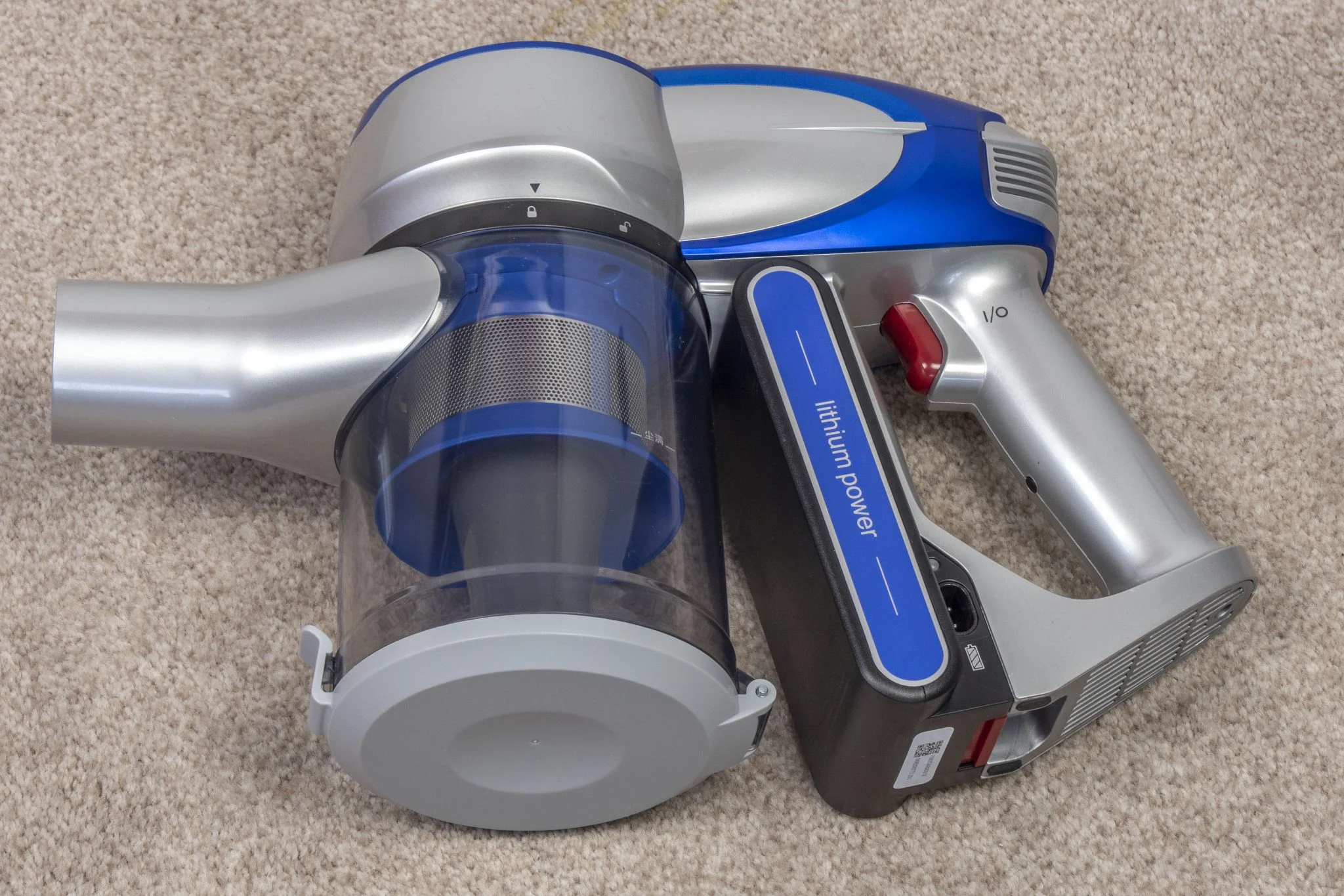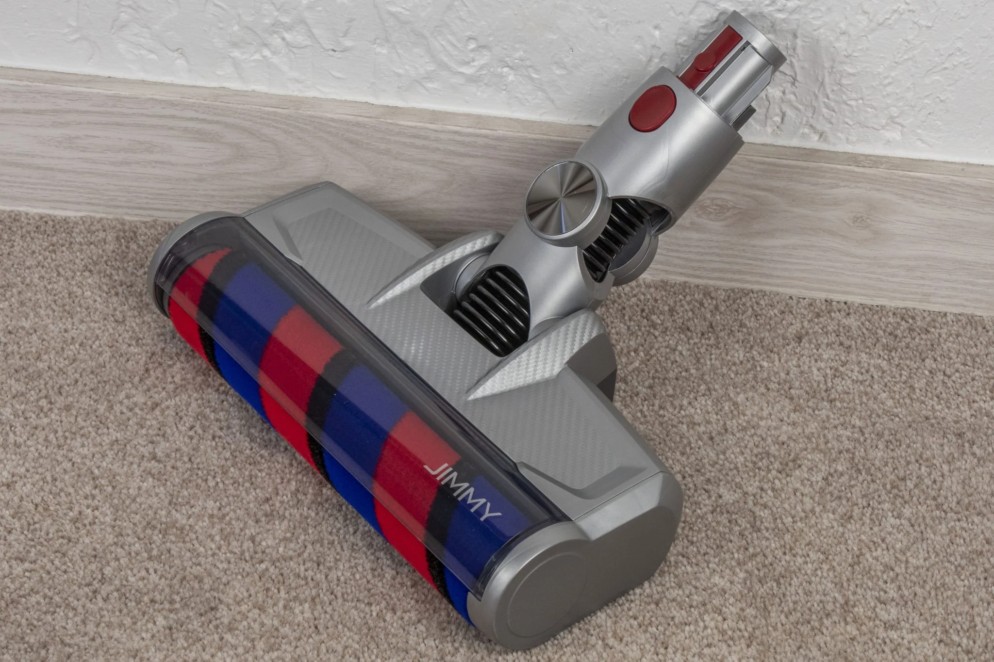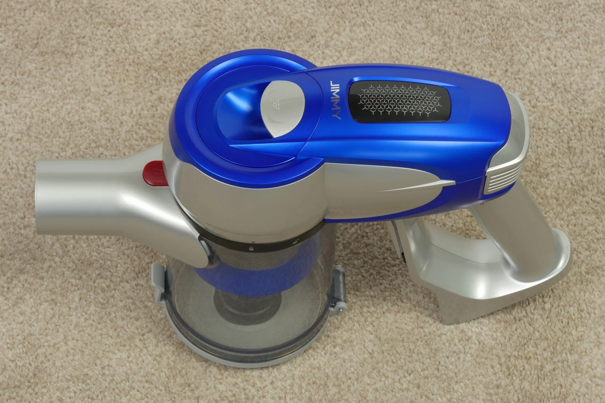 A dizájn egy picit eklektikus lett, nem egy Gaudi féle Sagrada Familia, de nem is égeti ki a retinánkat. Ami furcsa, hogy a toldócső felülete kifejezetten igényes, matt, homokszórást imitáló kékség, ehhez képest a központi darab ettől eltérő kékje eléggé bazári. Szoktam volt mondani, hogy a Xiaomi fehér kinézete unalmas, nos, a Jimmy JV83 egyáltalán nem az, de mondjuk ha a lakásban, a falra fúrva kéne minden nap nézegetnem, akkor lehet hogy valamilyen szolidabb színkompozícióra lenne igényem. Hiszen a barna-kék-piros és ezeknek az árnyalatai eléggé „kavalkadisztikus” összhatást hoznak létre.