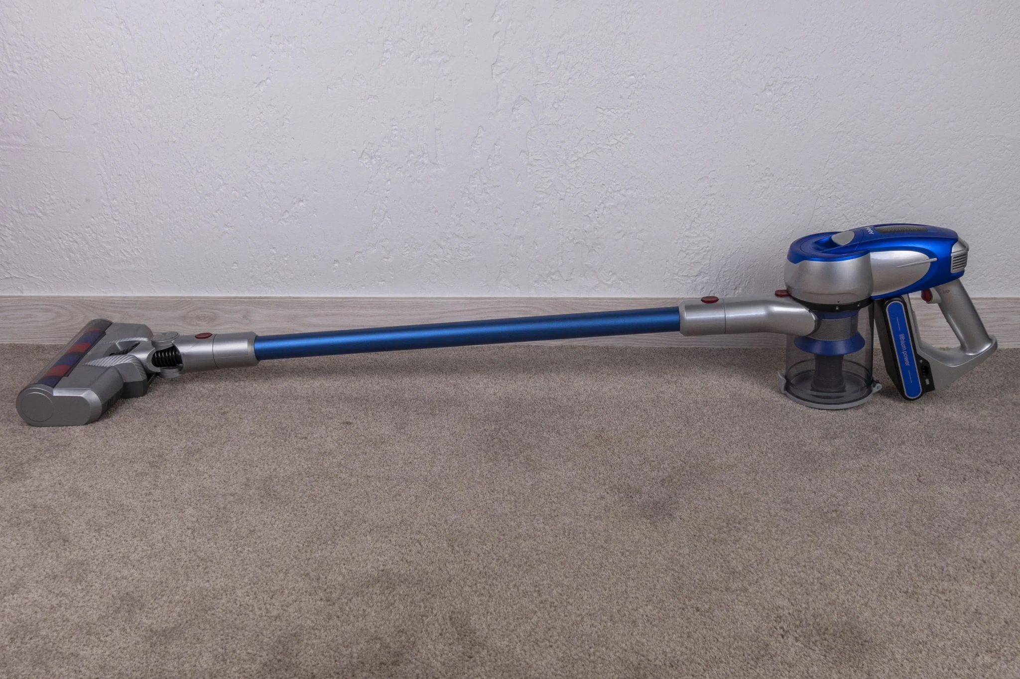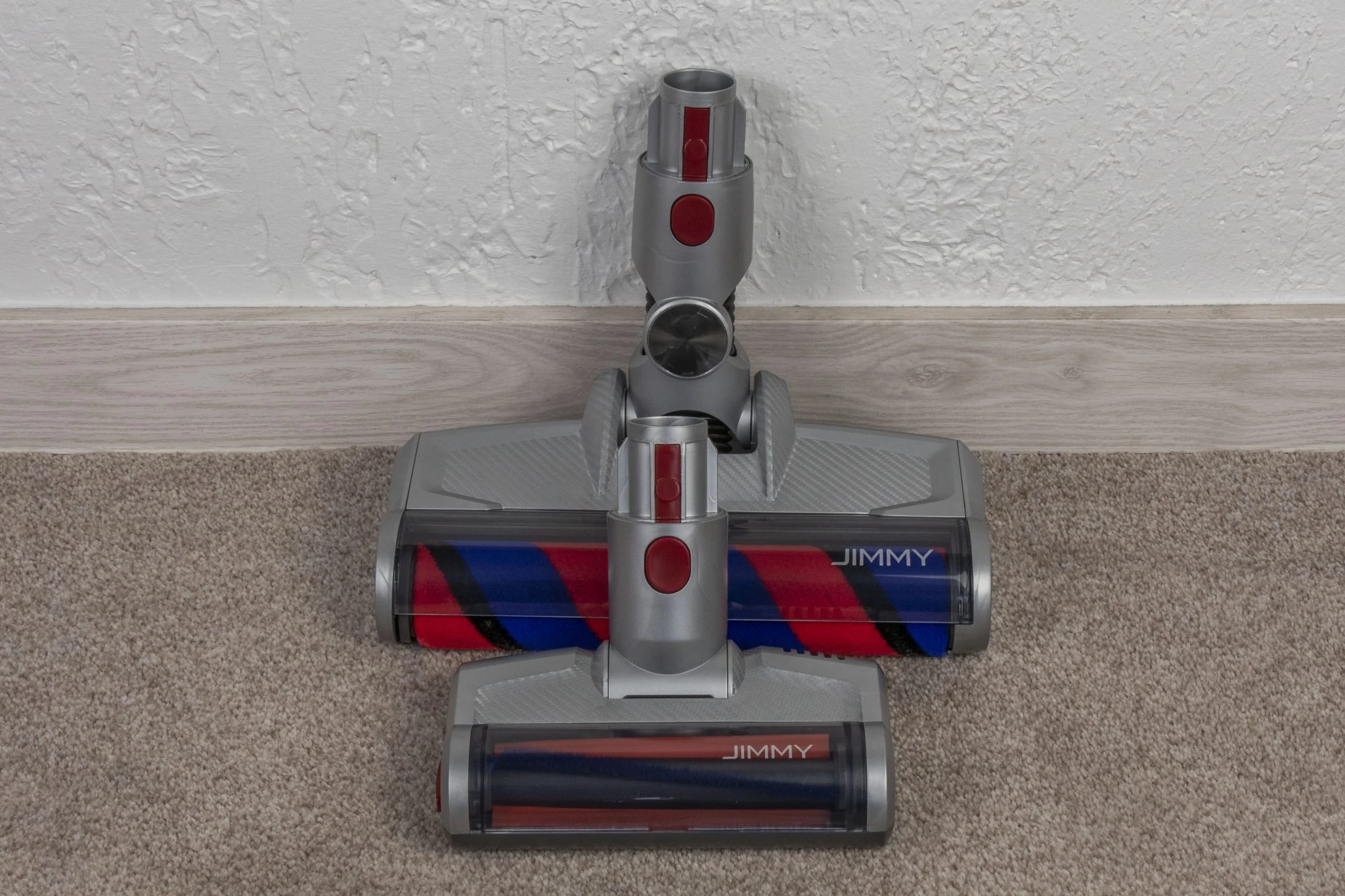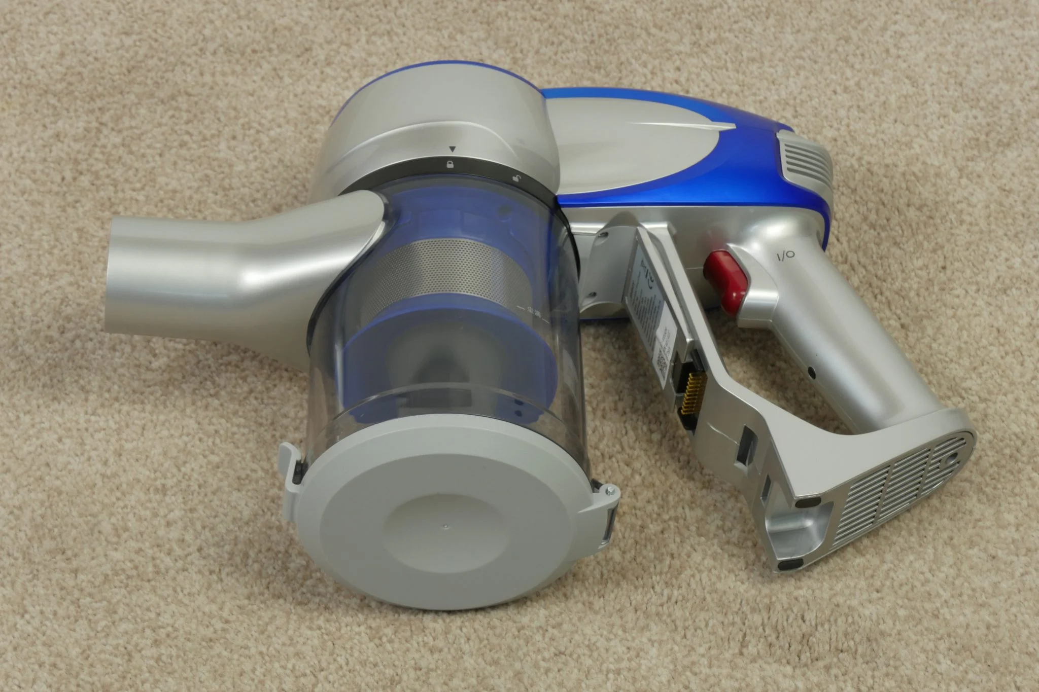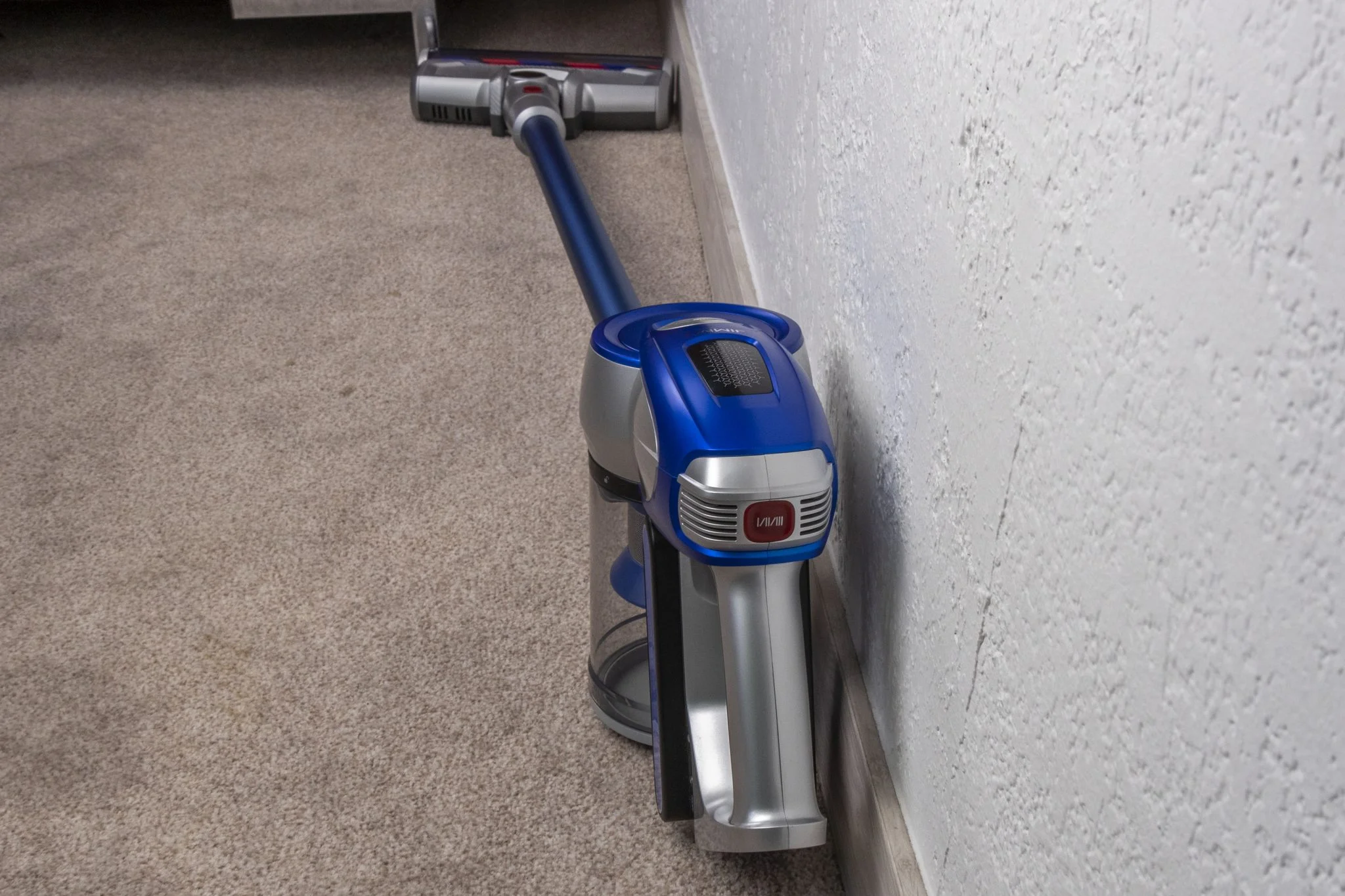 A dizájn egy picit eklektikus lett, nem egy Gaudi féle Sagrada Familia, de nem is égeti ki a retinánkat. Ami furcsa, hogy a toldócső felülete kifejezetten igényes, matt, homokszórást imitáló kékség, ehhez képest a központi darab ettől eltérő kékje eléggé bazári. Szoktam volt mondani, hogy a Xiaomi fehér kinézete unalmas, nos, a Jimmy JV83 egyáltalán nem az, de mondjuk ha a lakásban, a falra fúrva kéne minden nap nézegetnem, akkor lehet hogy valamilyen szolidabb színkompozícióra lenne igényem. Hiszen a barna-kék-piros és ezeknek az árnyalatai eléggé „kavalkadisztikus” összhatást hoznak létre.