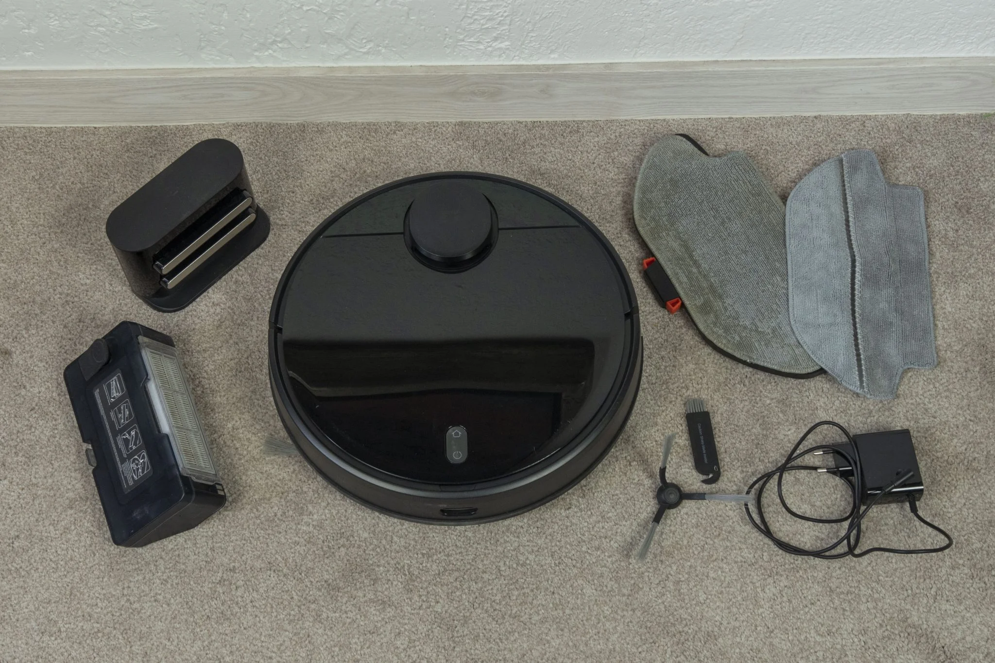 A két modell közötti szembetűnő különbség, hogy míg a Vacuum-Mop kamerával térképez, addig a Vacuum-Mop Pro LIDAR szenzorral. Ez utóbbi a részletesebb megoldás, emiatt viszont magasabb a robot, kevésbé fér be a bútorok alá. A doboz tartalmát érdemes megszemlélnetek, kaptok egy oldalsó pótkefét, 2 db tartályt – egyik egy 500 ml-es por, a másik egy kombinált, 300/200 milliliteres tároló -, felmosó párnákat a konzoljukkal és természetesen egy dokkoló-töltő kombót. Elvileg elérhető hozzá egy tisztán vizes tartály is, amit külön vásárolhattok meg, amennyiben szeretnétek a feltörlést preferálni.
