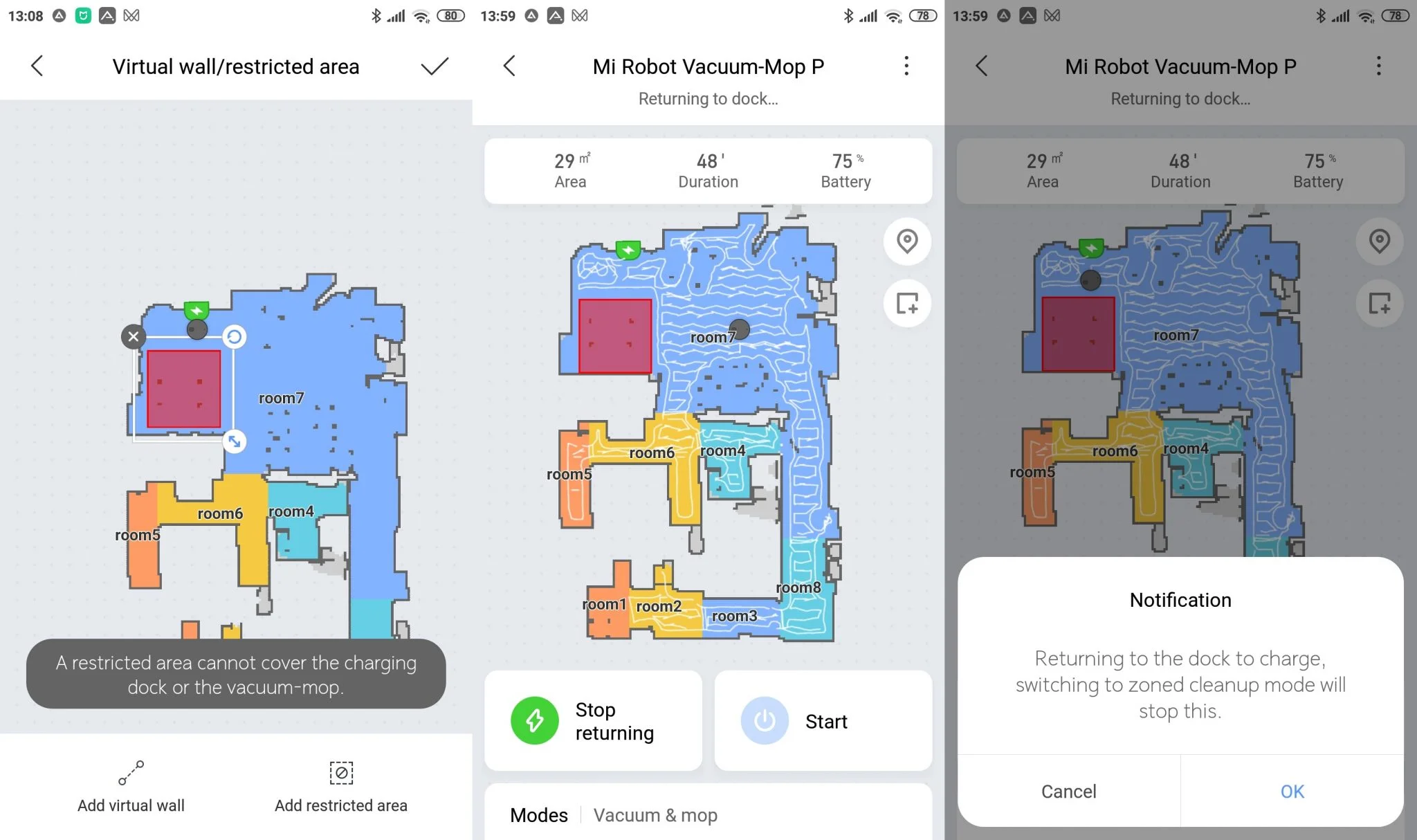 - A virtuális fallal és a no-go zónával nem lehet letakarni a dokkolót, sőt a no-go zóna területén túl lóg egy külső keret is. Emiatt érdemes nem szőnyeg mellé tenni a dokkolót, amennyiben a feltörlés alól ki akarjátok zárni azt.