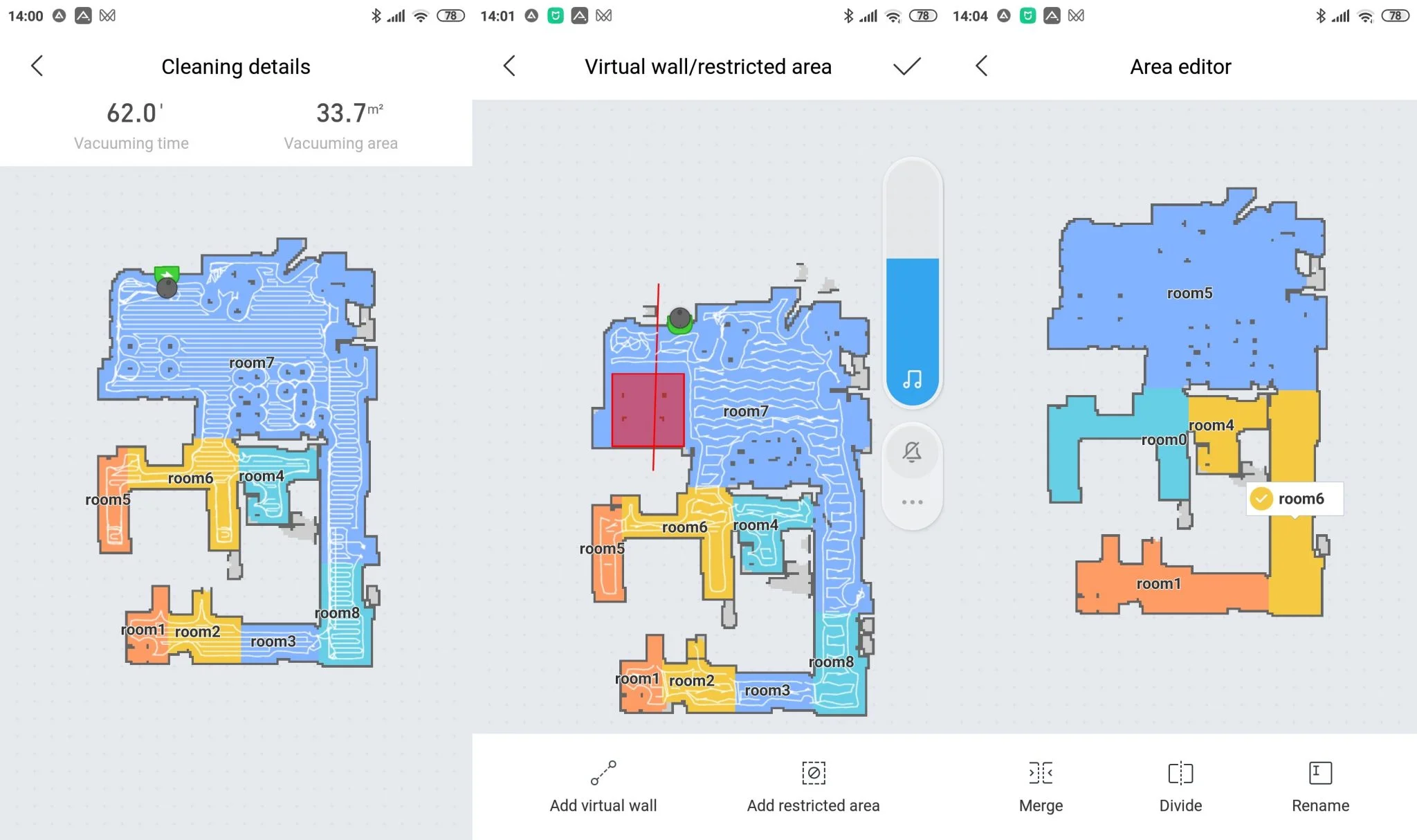 - A helyiségfelismerés nem mindig tökéletes, de ha nem találja el a határvonalakat a robot, akkor bármikor újraszabhatjátok a területet (viszont összevonni egyszerre csak két szobát lehet).