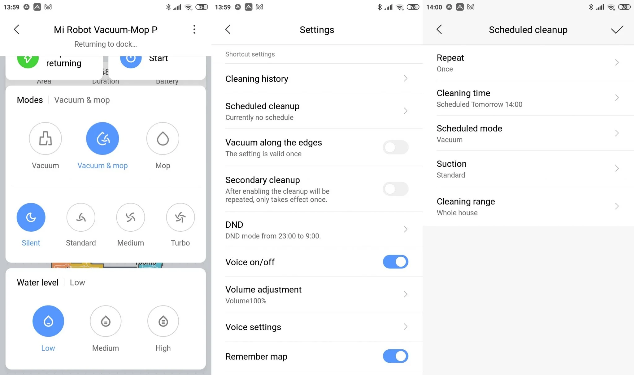 A funkciókat a szokásos dupla gombos – bekapcsol, bedokkol – rendszerrel lehet vezérelni, de ezt nem sokat fogjátok használni, ugyanis a Mi Home-ból minden fontos funkció elérhető. A felület gyakorlatilag ugyanaz, mint az előző termékeknél, így aki valaha használt már Xiaomi Roborock porszívót, az könnyedén megtalálja a lehetőségeket a menürendszerben.
