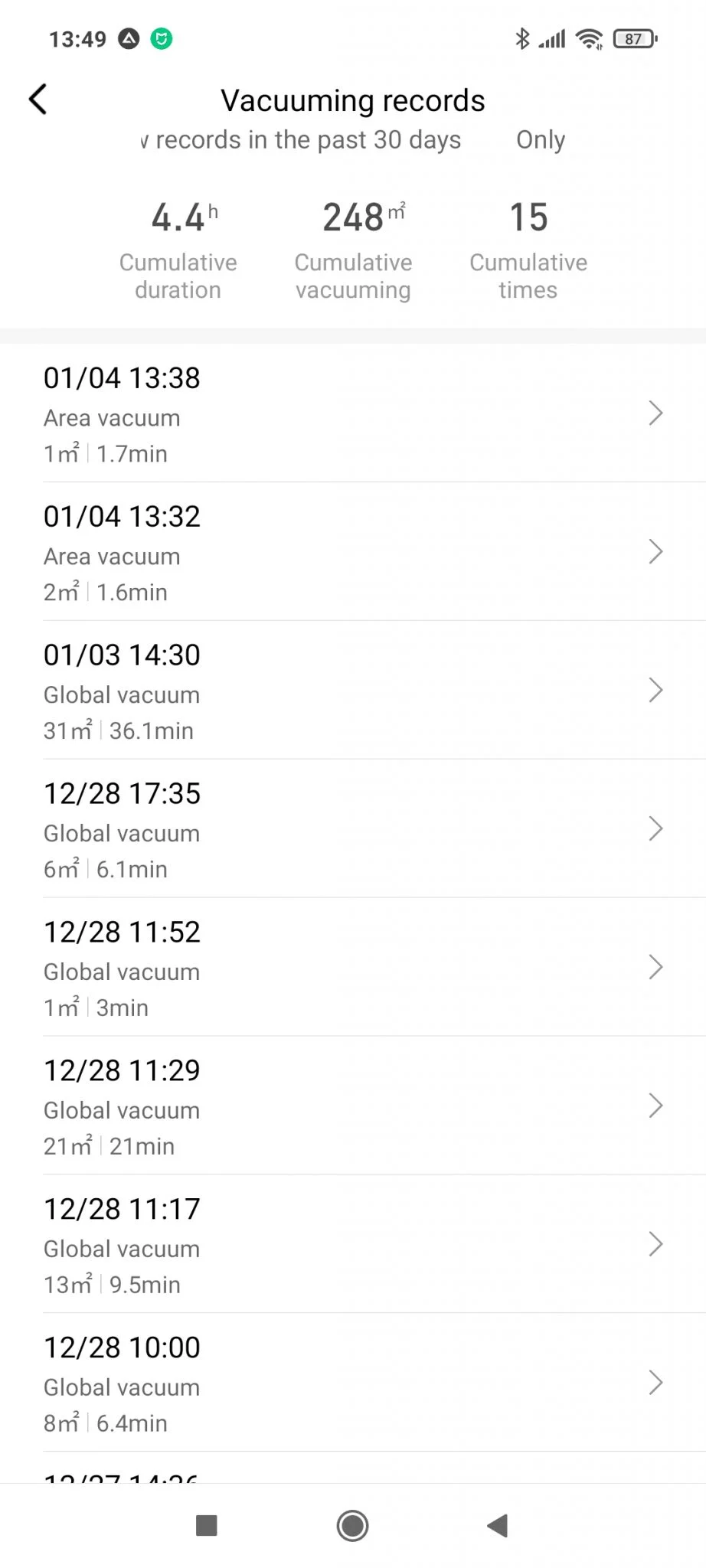 - kopó-fogyó eszközök állapotának kijelzése (de a zsák telítettségét az appban nem, csak a töltőállomáson jelzi)