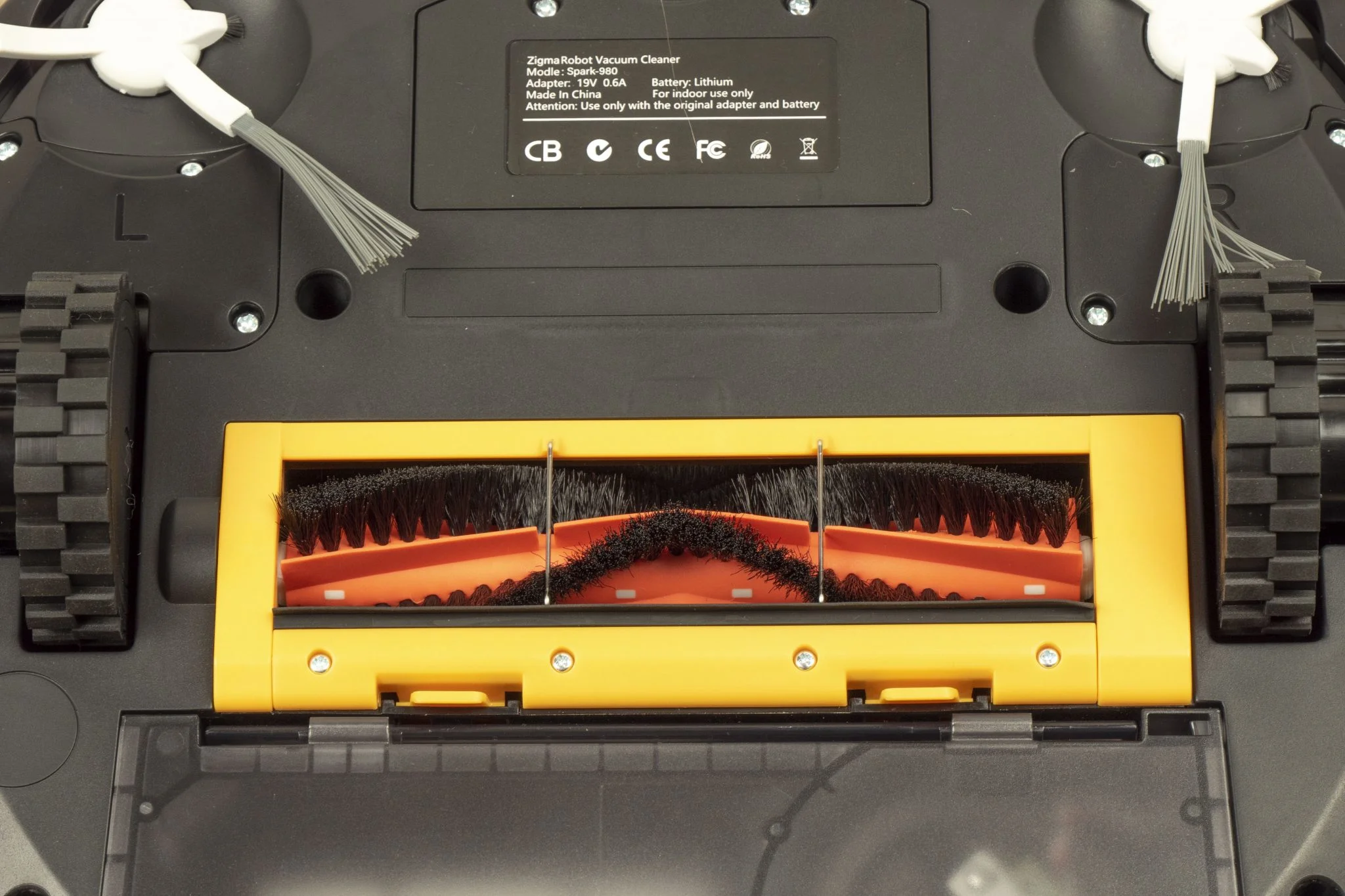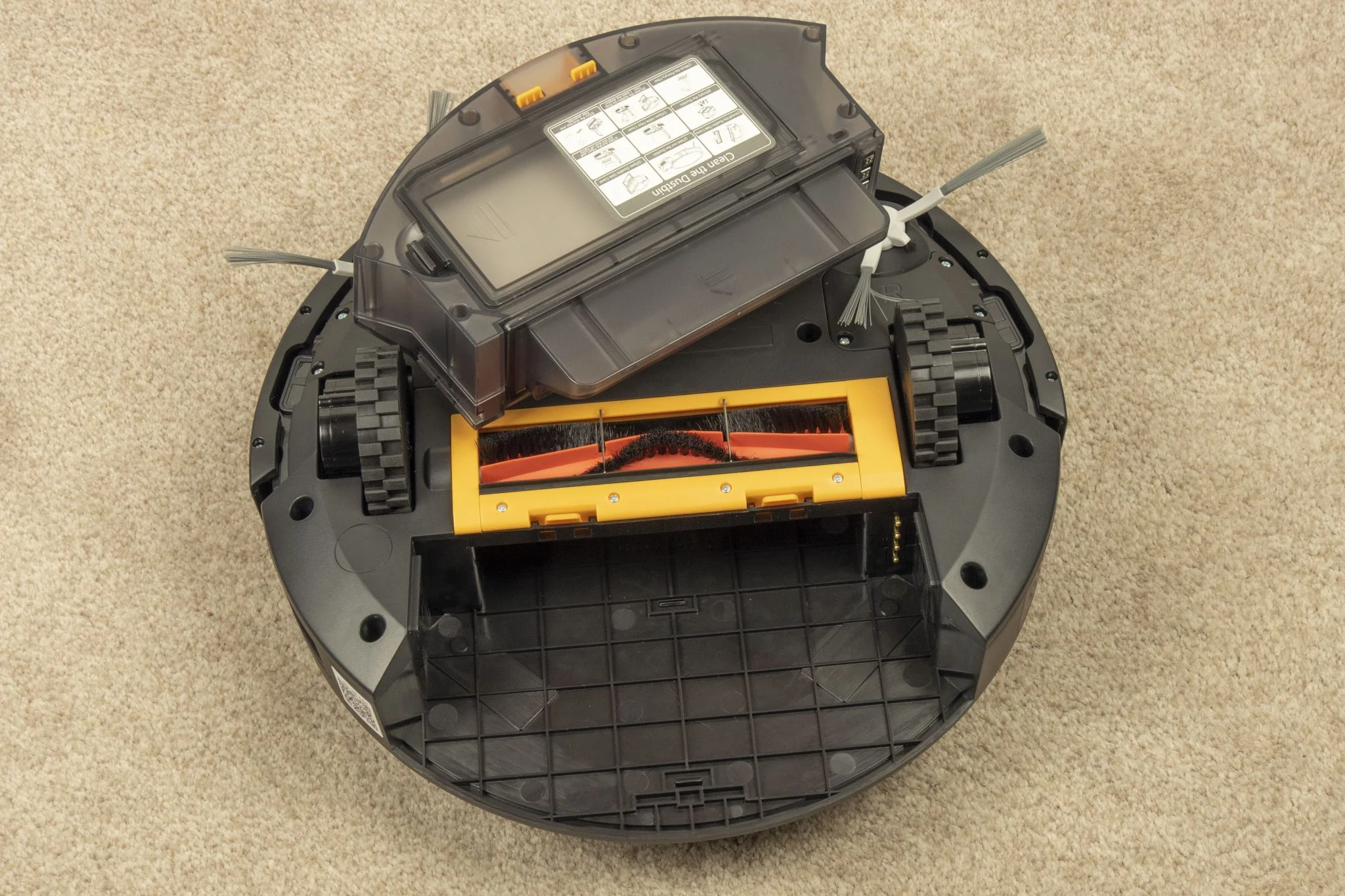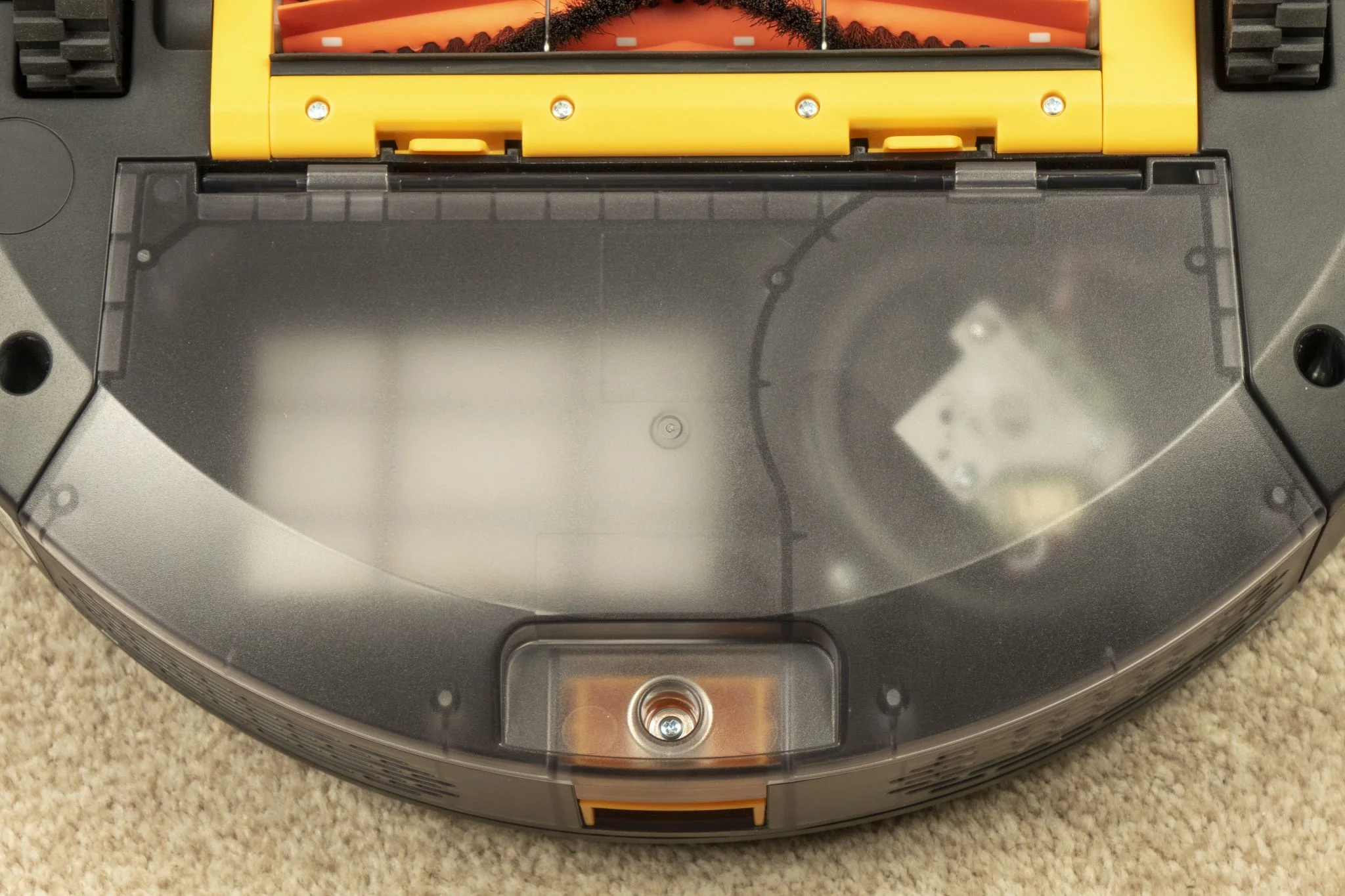 A hason néhány érdekes részletet fedezhettek fel. Az egyik a hengerkefe, ami a szőnyegek hatékony tisztításához szükséges, a másik az elfordulásért felelős első görgő, amit rétegesen vontak be szilikon gumival, ami valószínűleg a hatékonyabb küszöbmászást segíti. A 600 ml-es portartályt nem felfele, hanem hátra húzhatjátok ki, és végre van egy kis lamella, ami megakadályozza a kosz visszahullását. Van még egy specialitása – ebből is látszik, hogy nem licenszelt, hanem saját fejlesztésű a termék -, a portartály oldalán „turbófeltöltő” gyanánt van egy motor, ami talán a levegő átnyomását könnyíti meg.