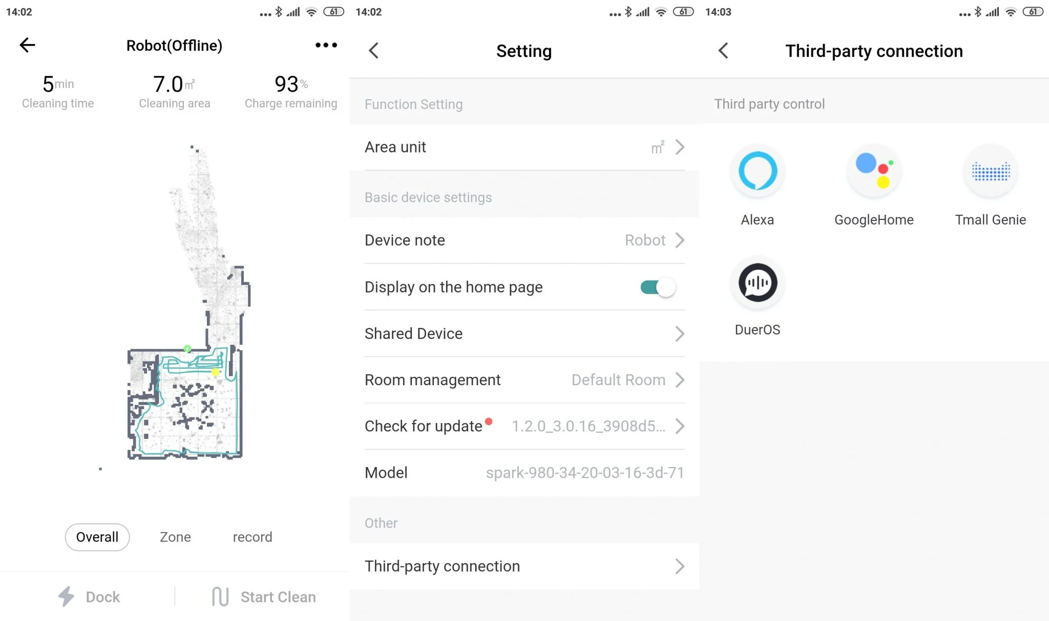 A Zigmaban az a nagyszerű, hogy lehetőséget ad okosotthonos integrációra is, ezt a „third party connection” menüpont alatt találjátok meg. Alexa, GoogleHome, Tmall Genie, DuerOS lehet a kiválasztott rendszer, ezeket sajnos eszközök hiányában nem tudtam kipróbálni. Az okosotthonos logika tetten érhető máshol is, a Boole algebra szabályai szerint lehet például beidőzíteni a robotot. Vagyis nem azt látjátok, amit más porszívóknál, hogy benyomkodjátok az időpontot, és arra elindul az időzített takarítás, hanem VAGY/ÉS kapcsolókkal összerakhatjátok, mit csináljon.