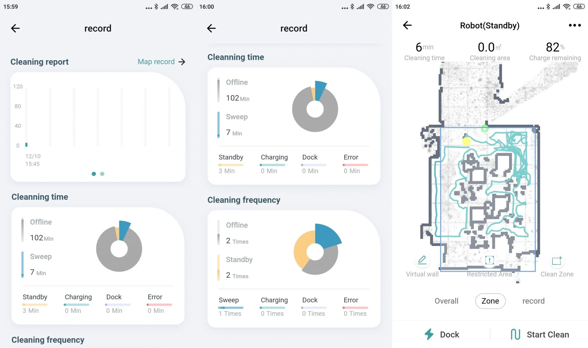 A takarítási statisztika is egy viszonylag ritkán implementált funkció, egy tortadiagramba rendezve láthatjátok a különböző működés állapotokat – standby, takarítás, dokkolás, hiba stb. -, illetve ugyanitt megnézhetitek az előző takarítások térképeit. Hiányoltam viszont azt, hogy ezeket nem lehet visszatölteni, és ez alapján újra lefuttatni, mert ennek a lehetőségnek akkor lenne igazán értelme. Mint ahogy nincs „szőnyeg mód” sem, ezt ellentételezi a három fokozatban állítható szívóerő, igaz a maximum csak 1200 Pa, de ez is bőven elég. A többi műszaki paraméterrel itt kaptok bővebb információt.