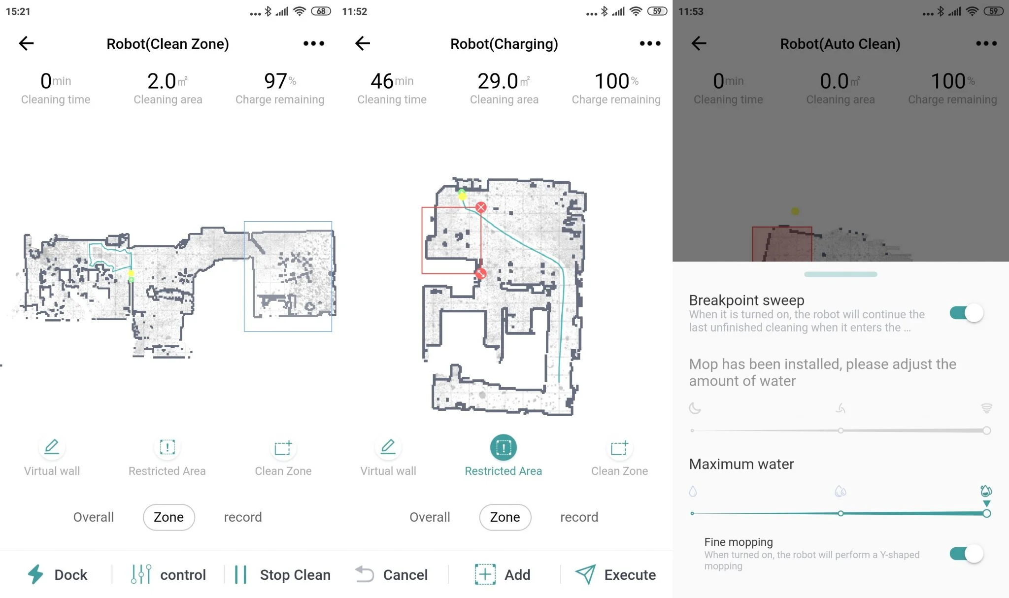 Így elvileg több robotot több dologra is felprogramozhattok, bár a lehetőségek egyelőre elég szegényesek, dokkoljon vagy takarítson, viszont látszik a törekvés arra, hogy a jövőben egyéb opciókkal bővítsék a rendszert. Érdekes még egy ritkán látható funkció a „breakpoint sweep”, amit folytatólagos takarításnak lehet fordítani. Lényege hogy a felépített térkép alapján a Zigma Spark megjegyzi, hol hagyta abba a takarítást a töltés előtt, majd oda visszatérve folytatja azt, ennek nagyobb ingatlanoknál lehet szerepe.