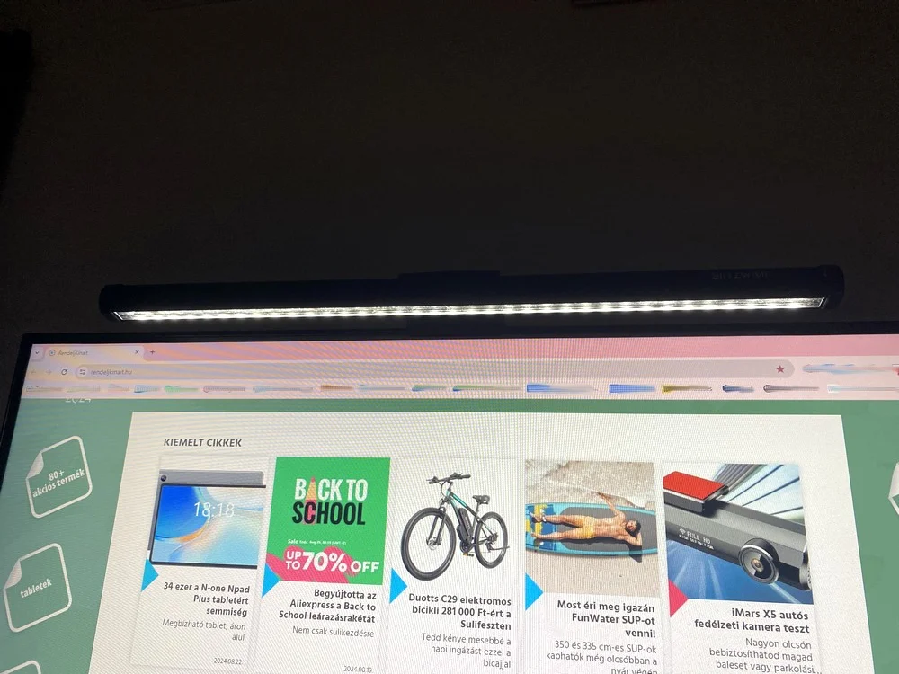 A 440×22 milliméter nagyságú monitorlámpán felül találsz még egy 65x68x19 milliméteres, asztalra helyezhető távvezérlőt a csomagban, illetve 2 mágnest és 2 ragacsot, így lehetőséged lesz két különböző monitorra is felrakni a kütyüt. Sajnáltam, hogy nem kinyitható ellensúllyal érkezik, ami gyakorlatilag bármekkora monitorra jó lenne, mert így csupán 15-25 milliméter közötti vastagságúra ajánlott. Az enyém (ami nem mellesleg egy tavaly tesztelt, KTC H27V13 monitor, teszt itt) ezt sajnos nem éri el, mert csak 12 milliméter széles, így nem lepődtem meg, hogy a felragasztás másnapjára már egy kicsit bebukott a monitorlámpa. Ha nem megfelelő szélességű monitorra ragasztod, akkor benne van a pakliban, hogy hosszú távon elfárad a ragasztás.