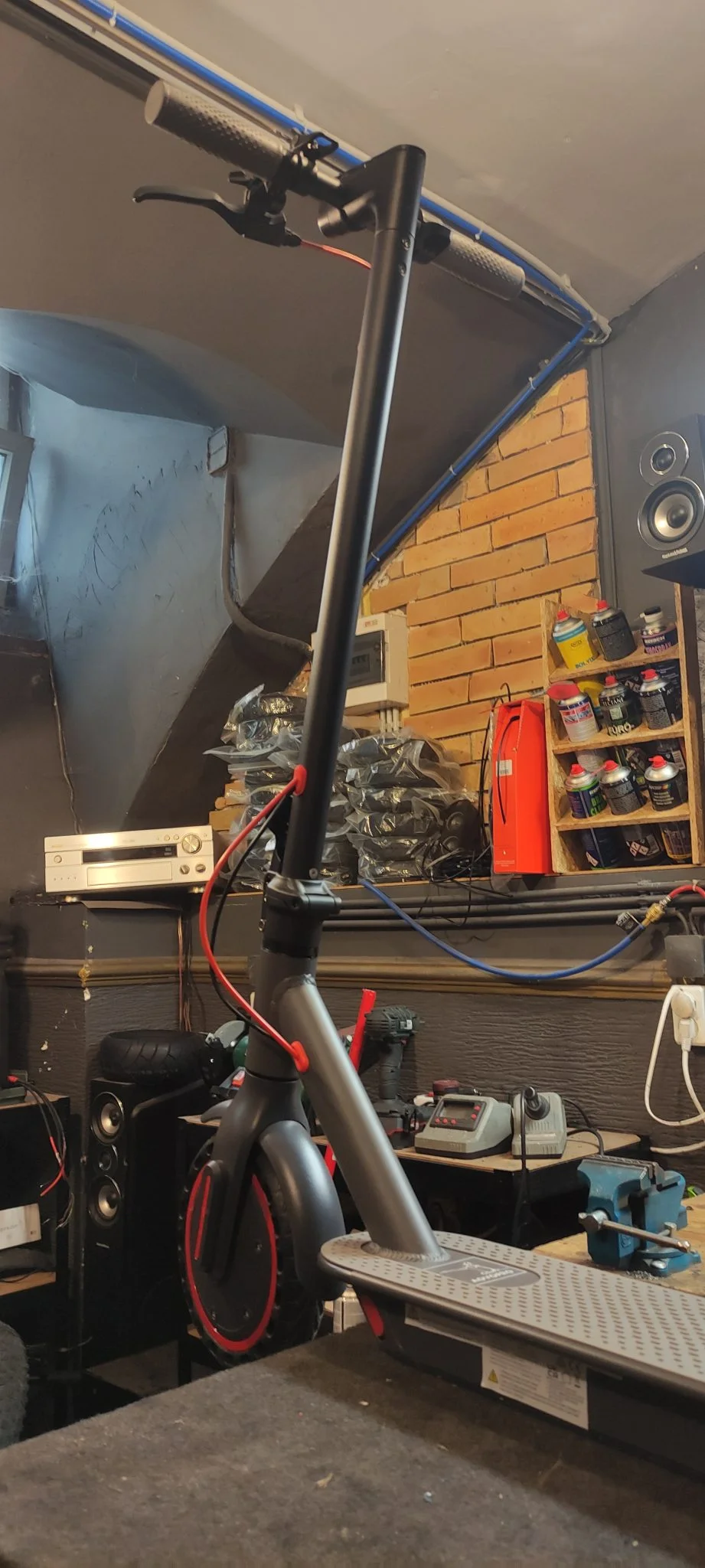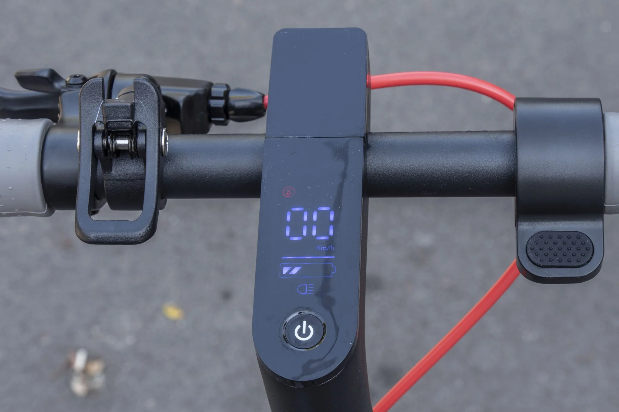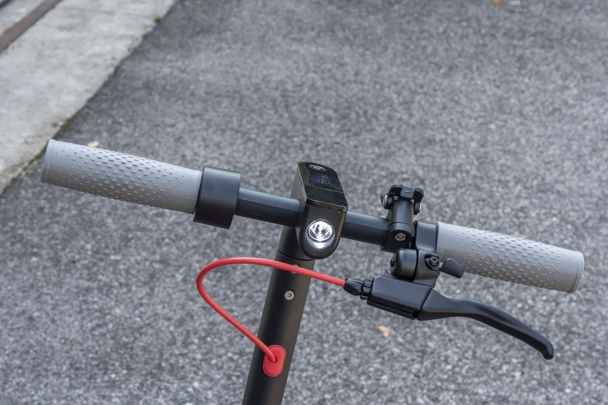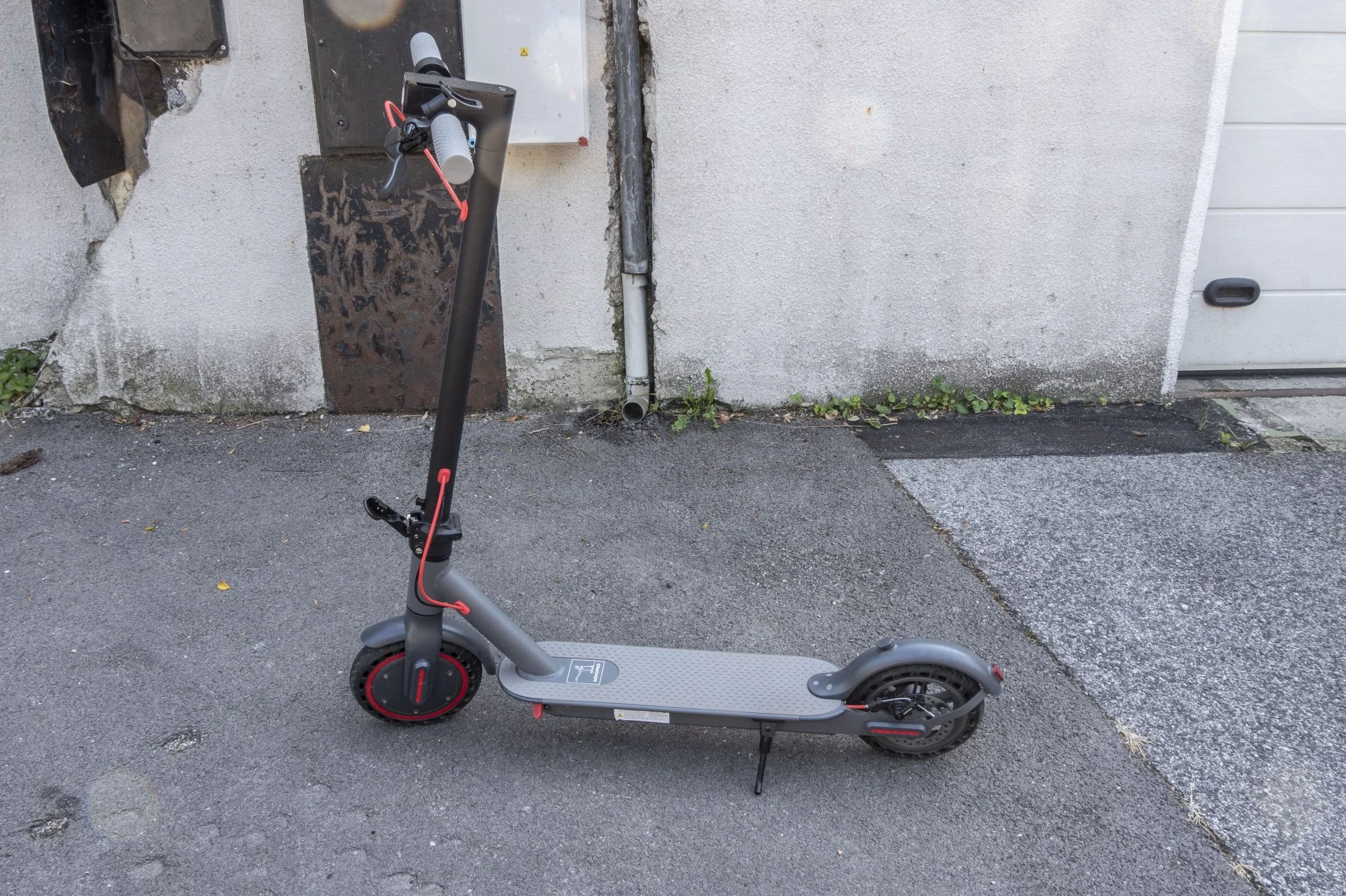 így padkáról le- illetve felugratással vigyázni kell, a sztender viszont a fellépő oldalára került, így nem csökkenti a hasmagasságot. A kormány keresztrúdja egy kicsit nekem keskeny, a markolatok tipikusan ebből a semmi extra anyagból vannak, ráadásul ha erőltettem, el is forogtak a csövön. Valahogy nem éreztem azt, hogy huzamosabb ideig szeretnék így 31 km/h-val menni, amibe egy kis küzdelemmel bele lehet zavarni a rollert.