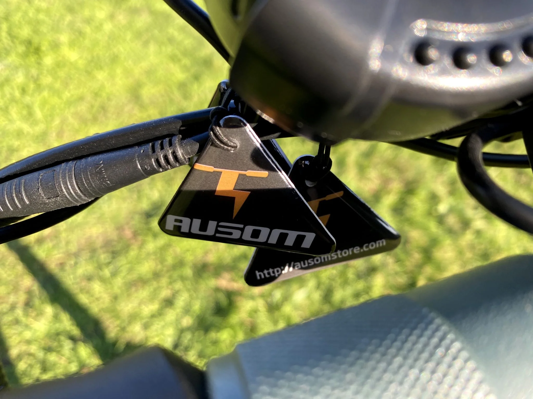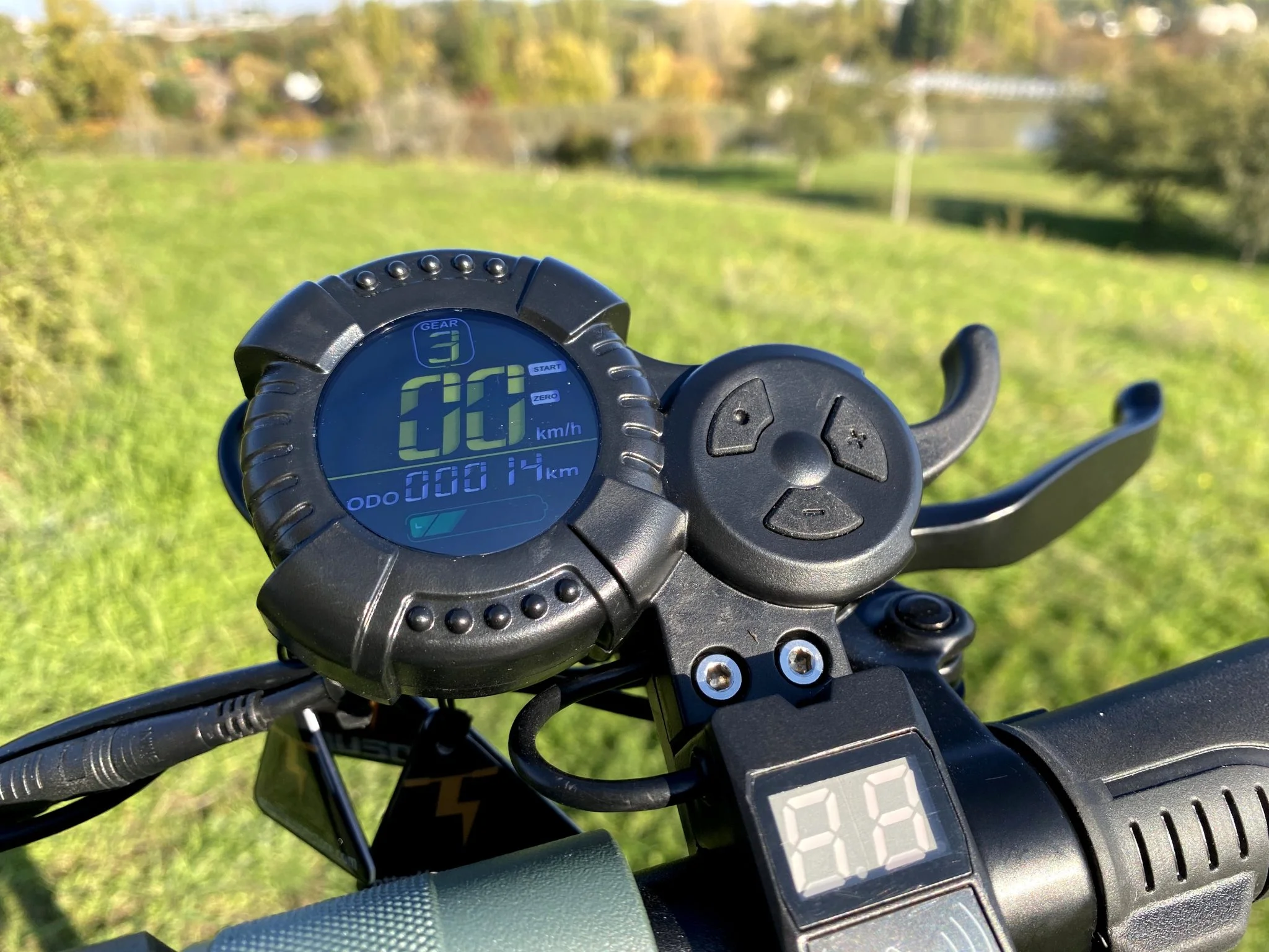 Az Ausom GX1-et NFC-s kártya segítségével tudod bekapcsolni, ami abból a szempontból előnyös, hogy csak a jogosult személyek képesek hozzáférni, bár, aki nagyon szeretné ellopni a járgányt, az így is megoldja, hiszen könnyű felkapni és elsétálni vele. Egyébként a komputer rejtett menüjében azt is beállíthatod, hogy kártya helyett a telefonoddal tudd bekapcsolni. A kormány jobb oldalán lévő LCD kijelző minden fontos, utazással kapcsolatos információt demonstrál, ilyen például az aktuális sebesség, a választott sebességfokozat, az akkumulátor töltöttségi szintje, az adott út (trip) vagy az eddig összesen megtett távolság (odoo) és a többi.