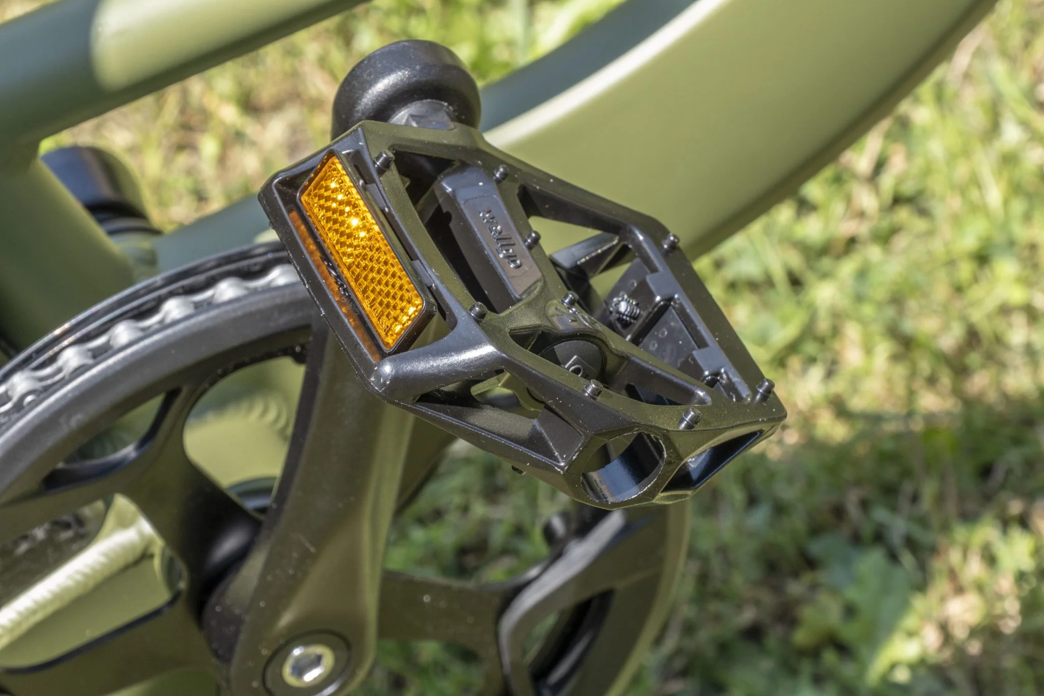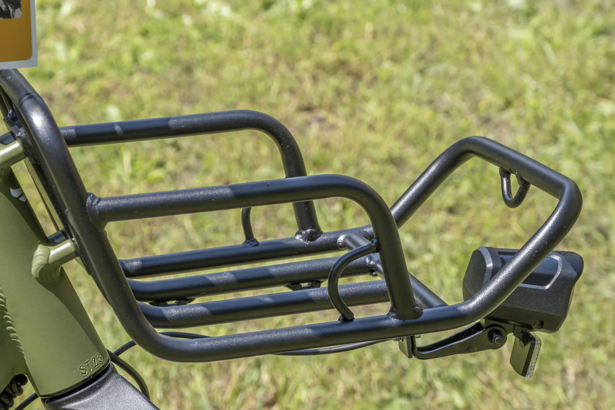 de egy ilyen kerékpáron nem áll rosszul a hetyke tartás. Aki ilyet vesz, egyébként is a divatot követi, abba meg belefér egy kis páváskodás. Érdemes még megemlíteni, hogy hasonlóan az Eleglide T1-hez, ez is egy step-thru modell, vagyis a vázat úgy alakították ki, hogy át lehet rajta oldalról lépni. Nincs felső merevítő, helyette az alsó csőváz sokkal masszívabb, így viszont a felülés nagyon egyszerű, hiszen nem kell átlendíteni a lábat a vázon. Van még egy specialitása a bringának, a felfele kihúzható akkumulátor, ami azért jó, mert így nem kell a bicót felcipelni a lakásba, elég, ha az akkut felviszitek. Hátránya, hogy amíg helyén van az ülés, nem tudjátok kihúzni, ha meg kiszeditek, akkor következő alkalommal lehet újraállítani, szóval láttam már ennél jobb megoldásokat is.