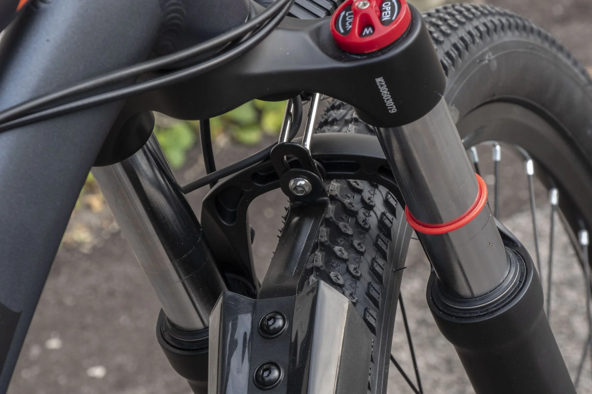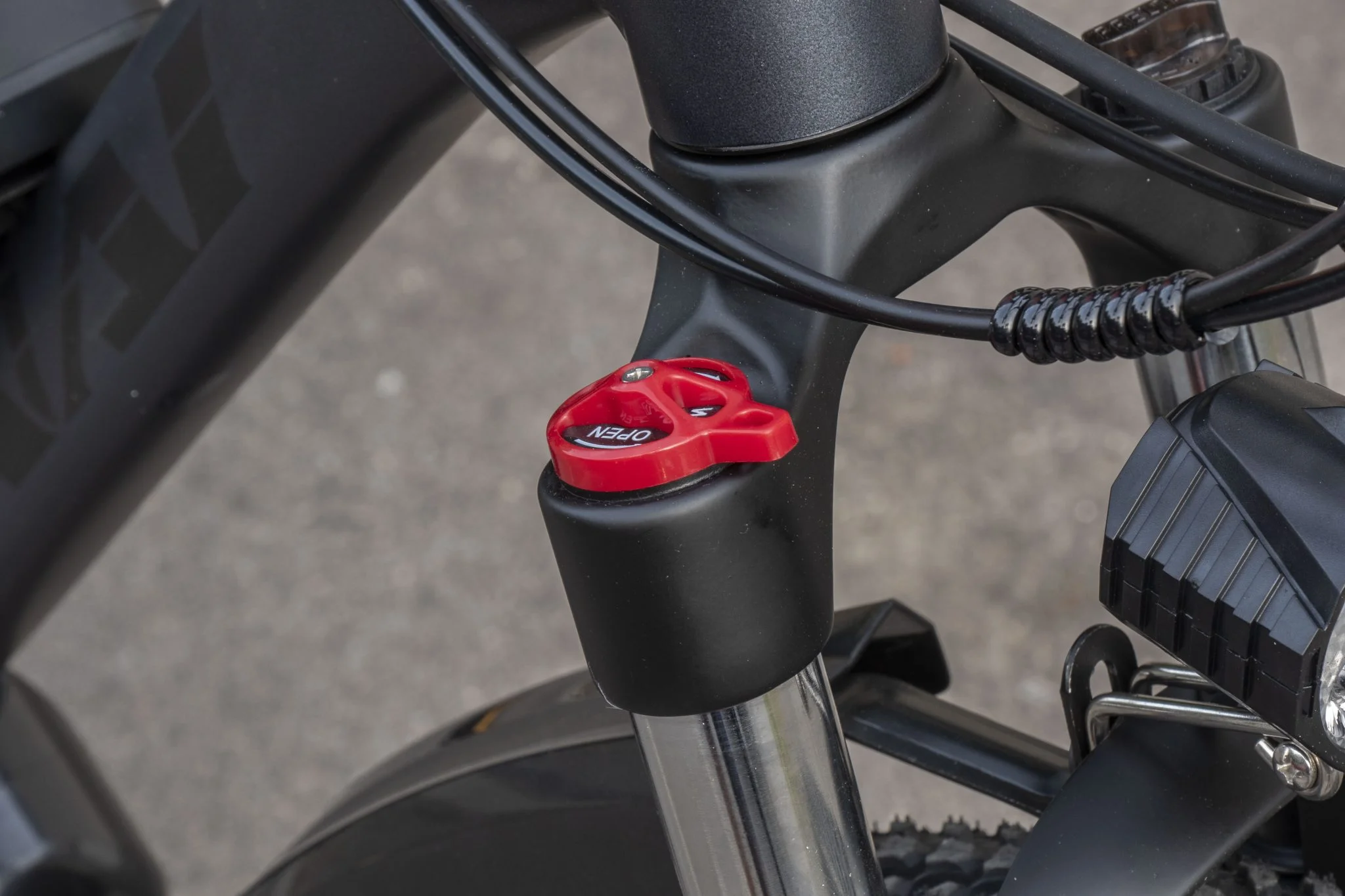 a hátsót még csak-csak pozícióba lehet állítani, de az elsőt a lámpával együtt kell felszenvedni egy nem átmenő csavarral. Zörög, elfordul, mindent csinál, amit nem szeretnétek, hogy csináljon, ráadásul a rezonancia miatt hosszabb távon állítólag törik is a tartófül. Az általános minőségérzetet a Duotts kapcsán sem dicsértem, és hát itt sem éppen patika, amit tovább rontott, amikor Roll-Base János megmutatta, mit is kell rajta igazából nézni. Az például eléggé gyalázatos, hogy az első tárcsafék meghúzására a fixre zárható első villa elmozdul az erő hatására. Ezt úgy tudjátok tesztelni, hogy óvatosan bedugjátok az ujjatokat az első teló mögé, majd meghúzzátok a féket, és hopp, majdnem becsípte az ujjperceteket a vas, vagyis hajlik a váz. Értelemszerűen ilyet nagyon nem kéne csinálnia, vagyis a vázra mondhatom, hogy egy olcsó, gyenge minőségű valami.