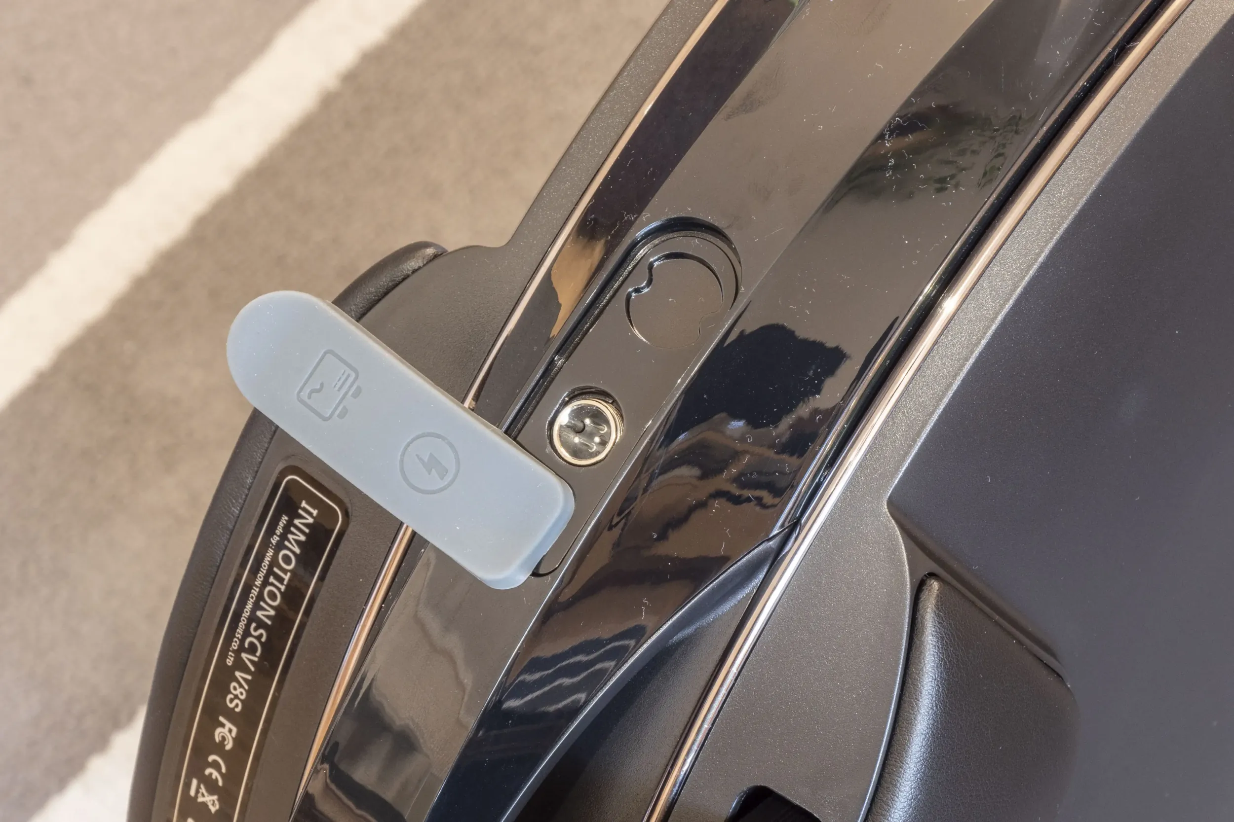 A narancs bekapcsoló gombot, a diszkrét fém csíkot az oldalán, a szürke töltőcsatlakozót takaró szilikon fedőt, amivel összejön az IP55-ös védettség, ezek mind apró részletek. Az Inmotion V5F még skorpiókaros volt, ennél szerintem menőbb az Inmotion V8S testbe tolható fogantyúja, ami enyhe cuppanással ugrik a helyére.