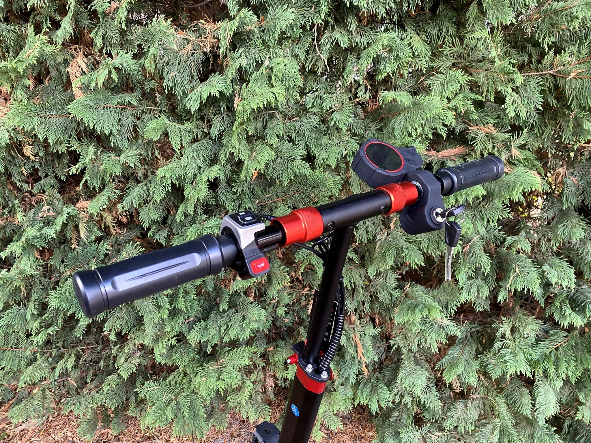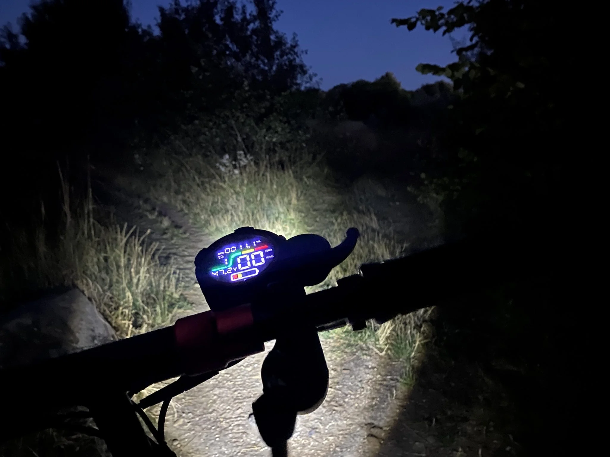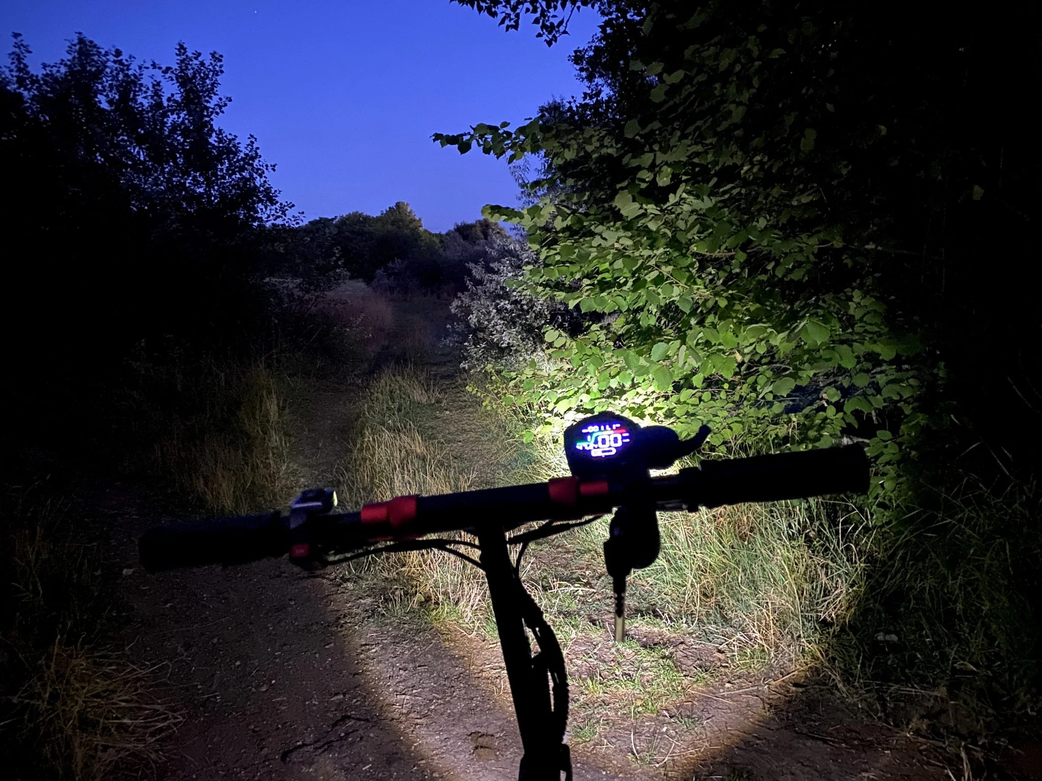 A duda és a fények kapcsolója a kormány bal szélére került, előbbi kellemetlenül hangos, a fények működésével kapcsolatban pedig 0 logika fedezhető fel. A kormányszár elején lévő, két hatalmas fényforrás 3-féleképpen is tud világítani: erős/halványabb fénnyel, illetve villogva. Ez tök szuper, az viszont már kevésbé, hogy ezt a folyamatos be- és kikapcsolgatásukkal tudod váltogatni, nem pedig „simán” csak egymás után. Fu€k logic. A roller taposóján piros színű féklámpát, a trepni oldalán pedig bazári RGB menetfényeket is találsz, utóbbit a sebességváltó gomb kétszeri rövid megnyomásával tudod életre kelteni, pedig a használati utasítás mást mond. Újabb fu€k logic. Nem mintha ez eddig nem lenne elég negatívum, de ráadásul az egész kormány rettentően keskeny, szinte már ez is zavaró, mert pont ott lenne kényelmes megfogni, ahol már véget ér.