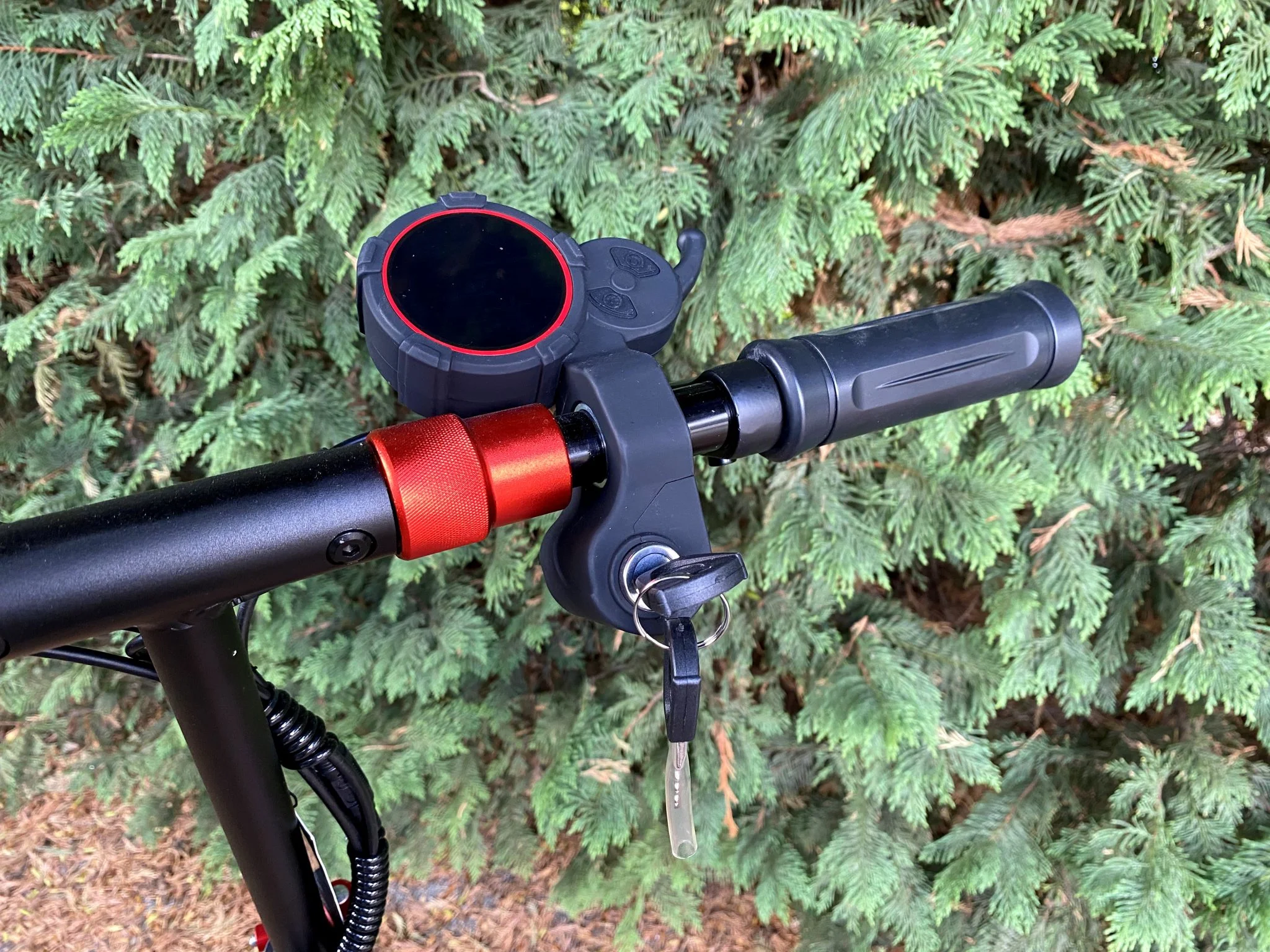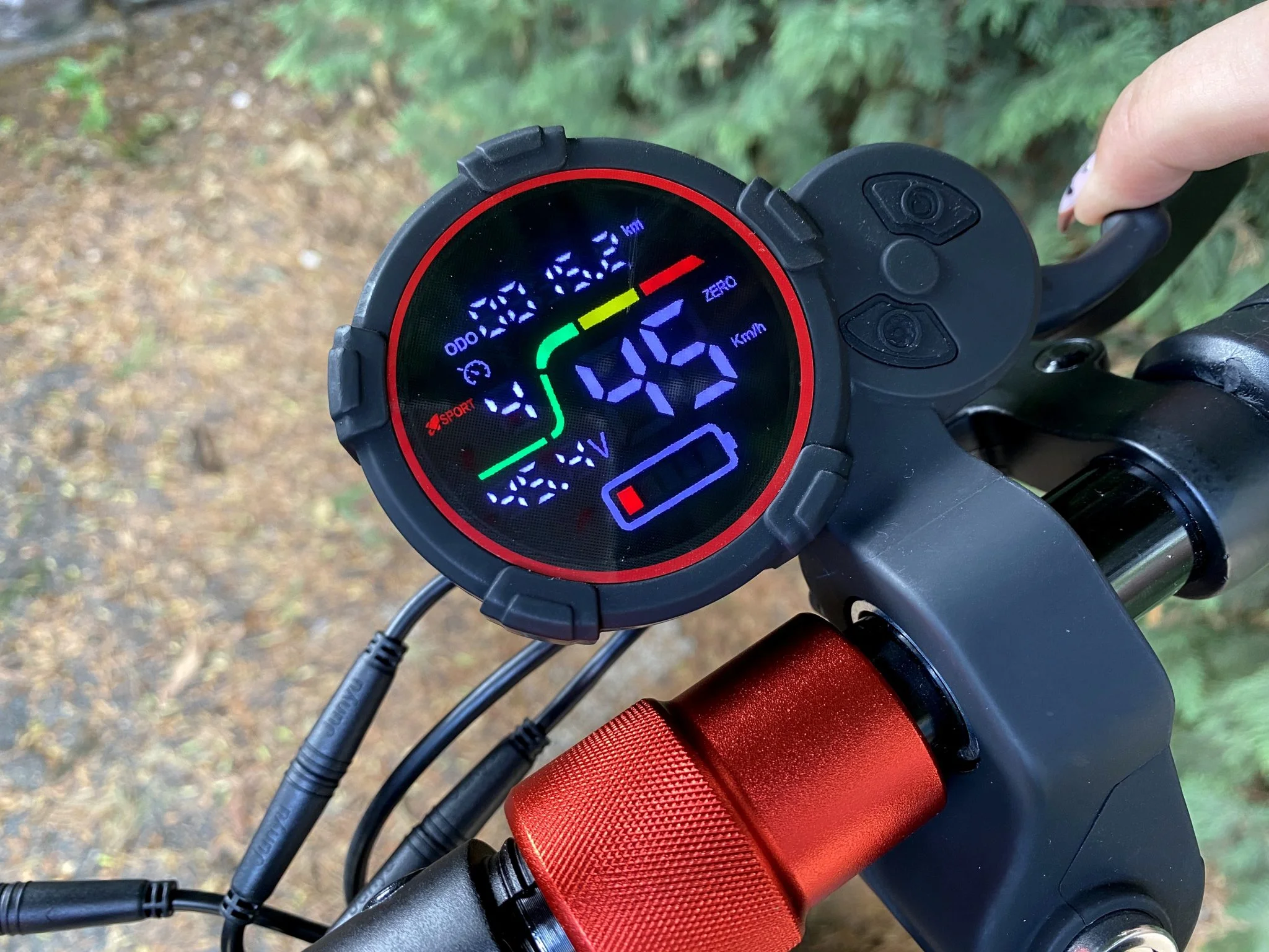 A kormányszár magassága 3 fokozatban állítható, de nem kérdés, hogy a nagy többségnek valószínűleg a legfelső beállításra lesz szüksége, ahogy nekem is az alig 170 centiméteres magasságommal. A kijelző a kormány jobb oldalán kapott helyet: érdekes dizájnja van, ugyanis kör alakú és nem túl nagy, viszont kellően informatív. Az alapvető menetinformációkat mindig elvárhatod tőle: aktuális sebesség, választott sebességfokozat, akkumulátor töltöttségi szintje, alkalmi/összesen megtett kilométerek száma, esetleges hibajelzések. Plusz szerencsére napfényben is teljesen jól látható, ami sok konkurens esetében nem így szokott lenni.