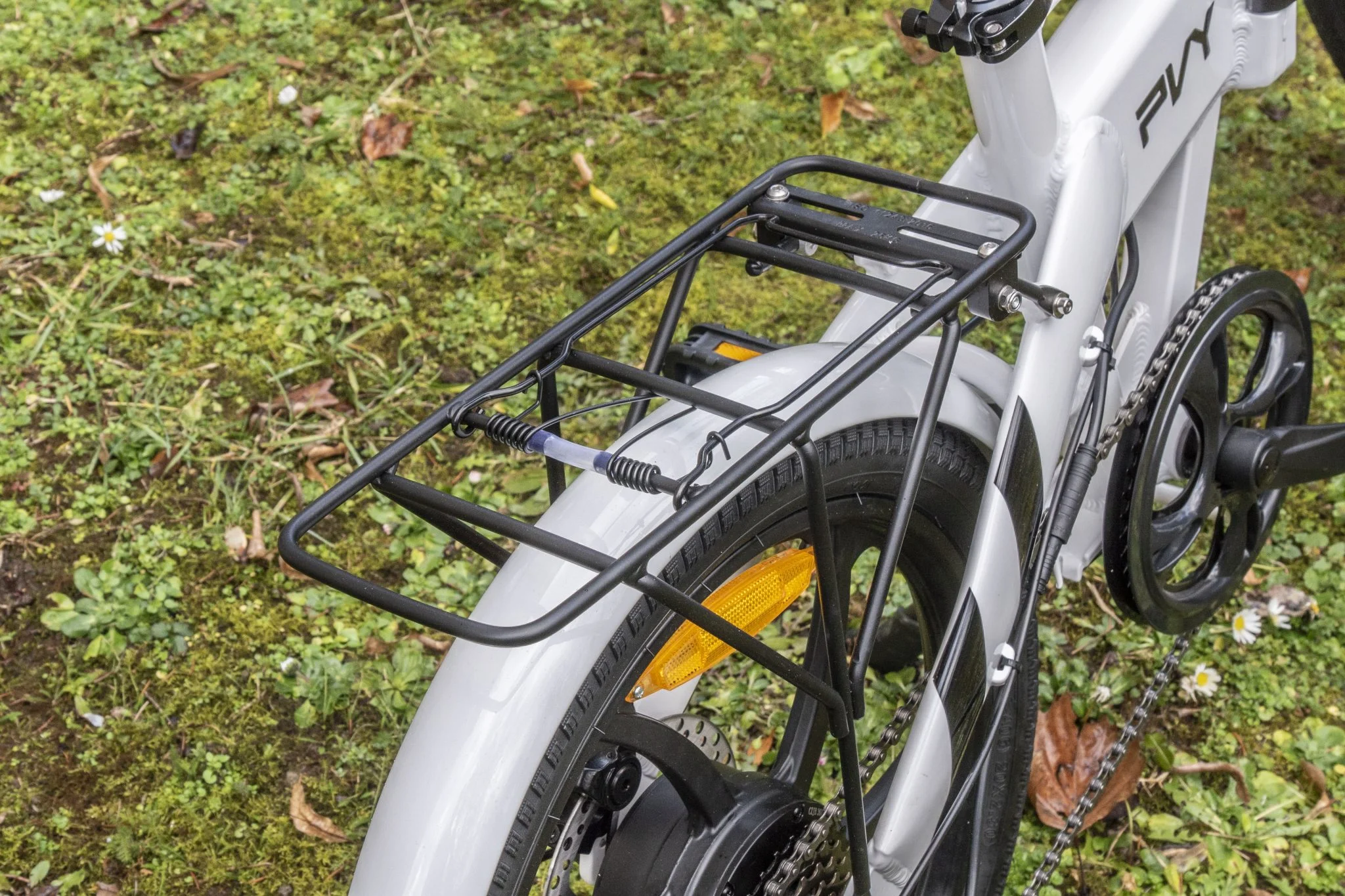 nem lehet a fedélzeti komputerről kapcsolni sem, szóval sok köze nincs a központi vezérléshez. Ami nagyon tetszett, az a hátsó rugós tartó, ami tipikus „trekkinges” kiegészítő, és lehet rajta a kis kosarat szállítani a boltból hazafelé menet. További kiegészítő a hátsó sárhányó és a csengő – amit szerintem fordítva raktak fel, mert nem a hüvelykujjam felé esett és így nehezen értem el a gombját –, illetve egy remek sztender, aminek jó nagy a talpa, így a bringa laza talajon sem dől el. Mint látható, a PVY Z20 Prót jól telepakolták kiegészítőkkel, egyetlen sirámom, hogy a magyar jogszabályok szerint kell egy piros hátsólámpa is, a prizma kevés és 500 W-os a motorja is, ez így már nem elektromos kerékpárnak minősül, hanem segédmotoros kerékpárnak, elméletben. Gyakorlatban meg mindenki magasról tesz rá, még sosem csesztetett a hatóság ilyesmi miatt, de ez ugye még változhat.