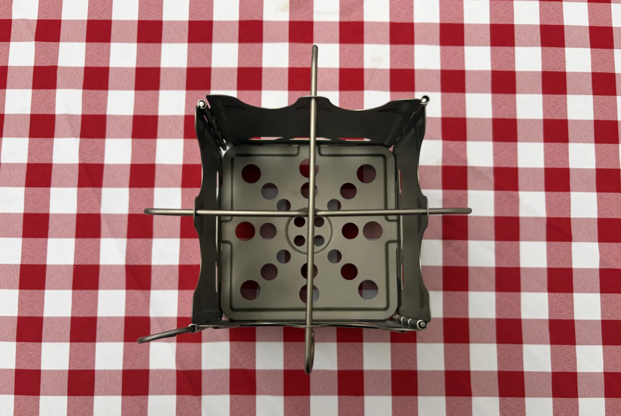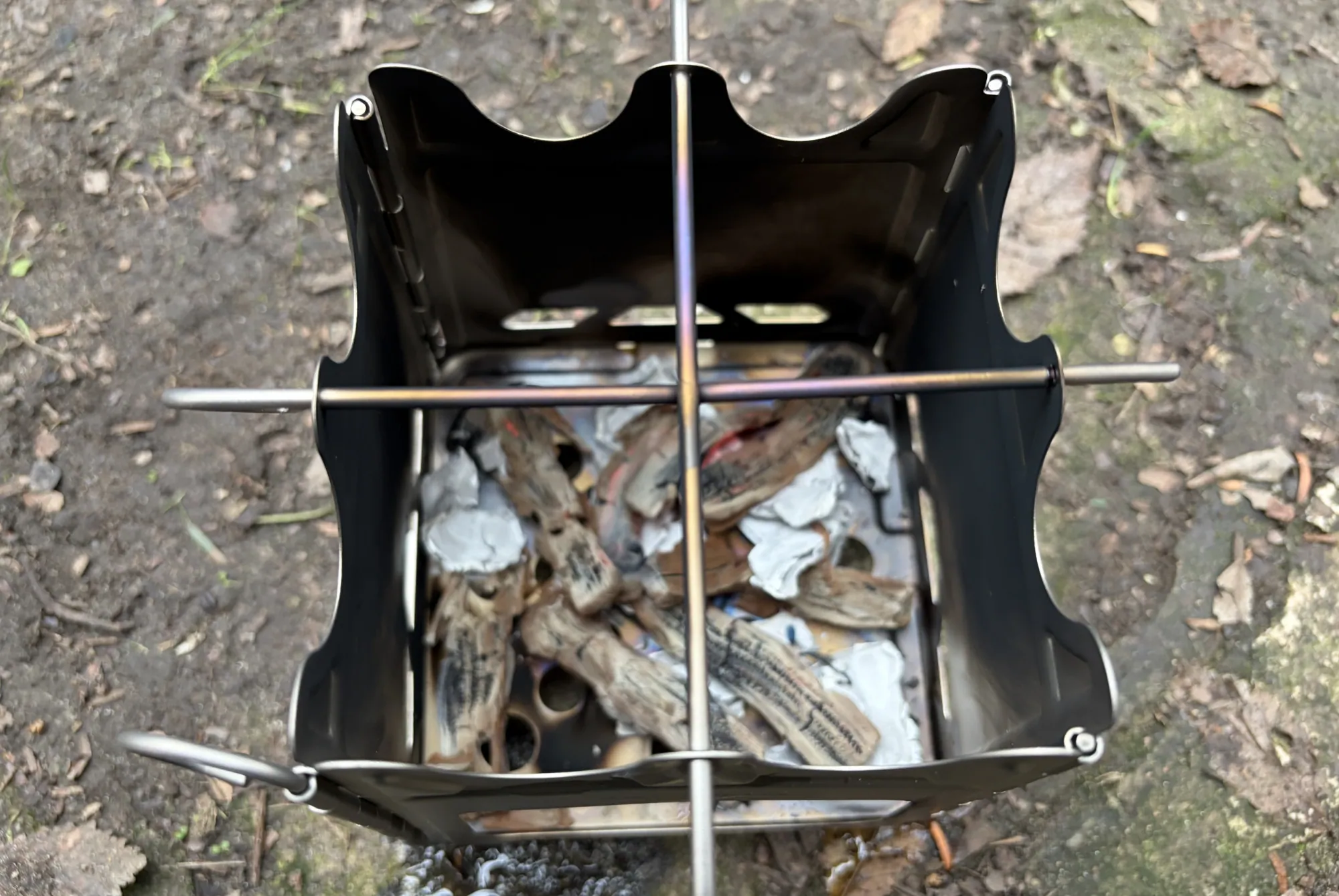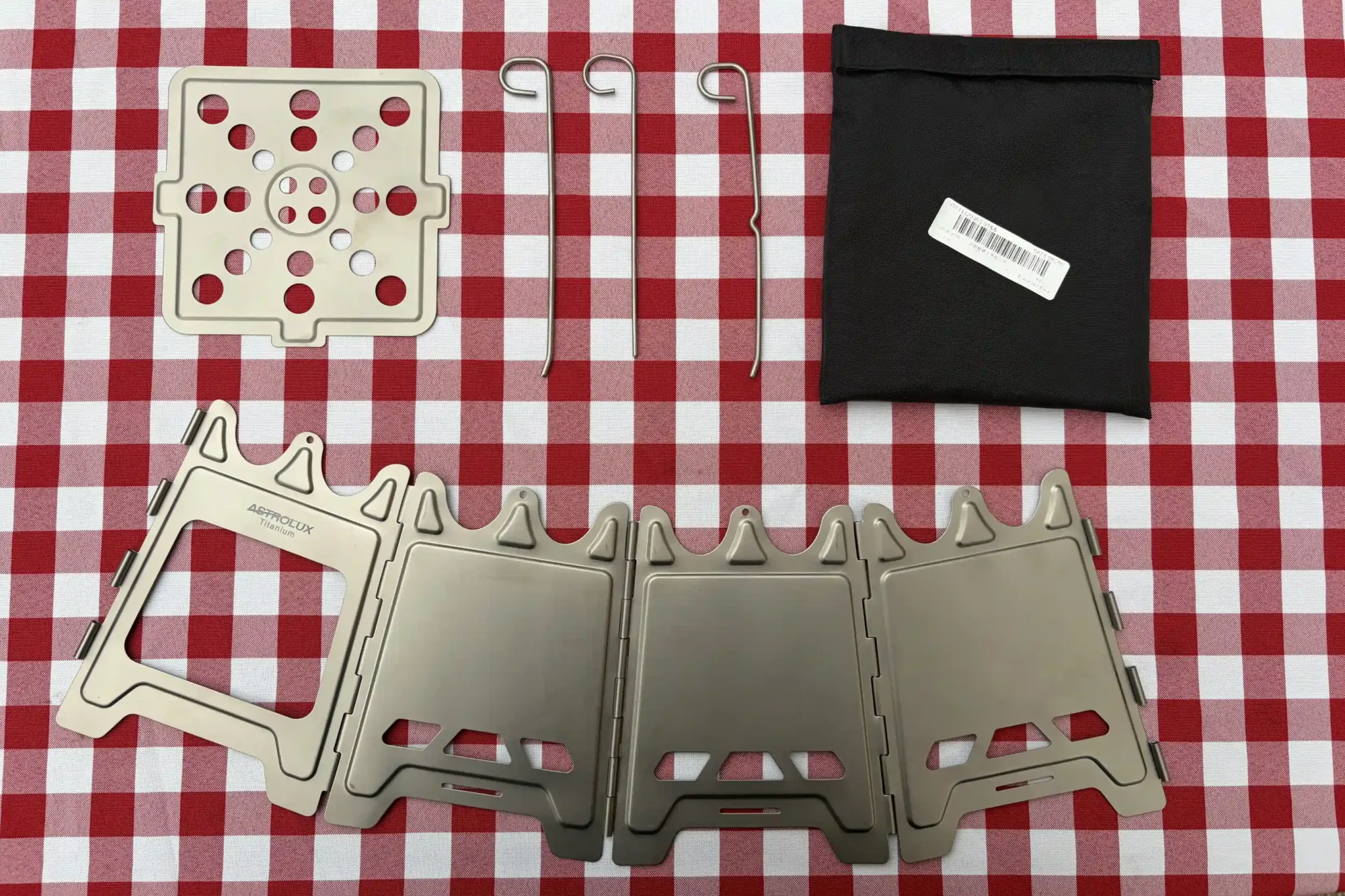 Az összeszerelése tovább erősítette bennem a korábbi pozitív benyomásokat. Annyiból állt az egész művelet, hogy az egymáshoz rögzített oldalait négyzetalakban összehajtottam, majd a szélein kialakított füleken átbújtattam a rögzítőpálcát, ezzel létrehozva az Astrolux Ti-BS1 kempingtűzhely vázát. Ezek után nem maradt más hátra, minthogy a maradék két pálcát a tetején lévő réseken átdugva behelyezzem a főzőrácsát is.