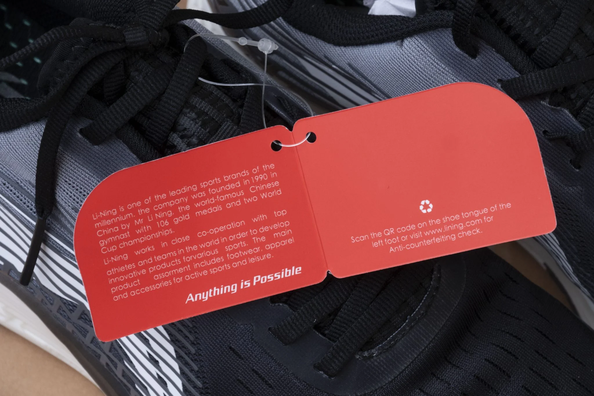 A Li-Ning Rouge Rabbit IV nem dobozban érkezett, hanem egy zsákban, ami nagyon praktikus, így hordozni is könnyebb. Érdekesség, hogy kaptam hozzá ingyen egy láberősítő gumiszalagot is, a cég igen bőkezű. A rajta lévő címke felirata teljesen angol nyelvű, ahogyan a sajtóanyag is a neten, látszik melyik piacra szánták a sporteszközt. Segítek, az USA-éra, hiszen több híres sportolót támogatnak, a kosárlabda környékén kell őket keresni. A cégnek van magyar szponzoráltja is: a gyorskorcsolyázó Liu testvéreket – és a Magyar Országos Gyorskorcsolyázó Szövetséget – is a vállalat támogatja. Feltűnt egy furcsaság, a Li-Ning a saját márkanevét nagyon diszkréten tünteti fel a cipőn – a típus fantázianevét meg sehol -, az LNRUN – vagyis Li-Ning Run – betűket az oldalán, a jelet pedig a talp részen és a mintába rejtve fedezhetitek fel, sehol máshol. Nekem ez jobban tetszik, mint például a hatalmas Nike pipa, de az biztos, hogy kevésbé erősíti a márkahűséget és nehezebb is azonosítani a hovatartozást, mondhatjuk, elég béna a Li-Ning PR gépezete.