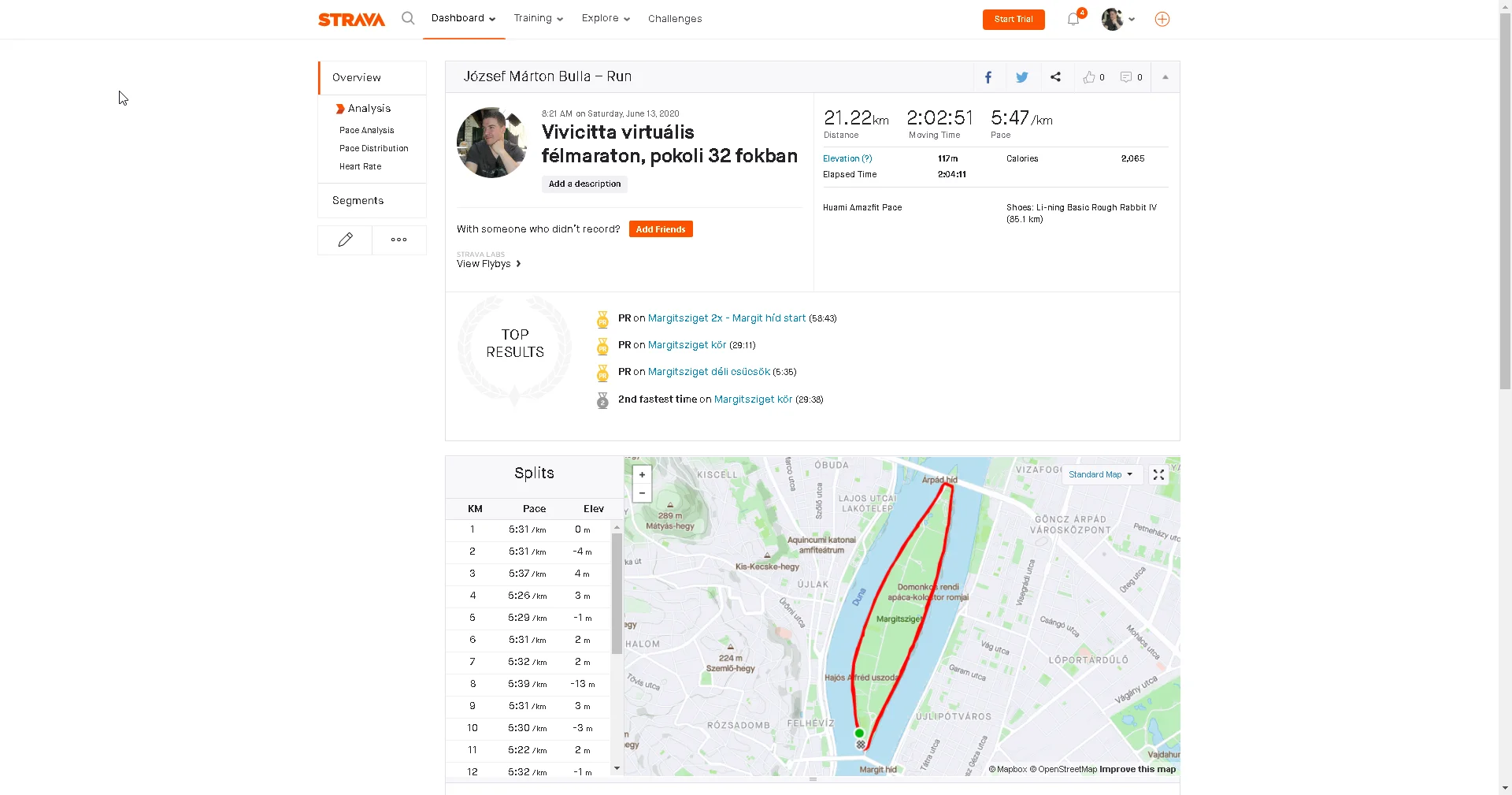 Tettem továbbá egy vállalást, hogy nevezek a termékkel a Telekom Vivicitta 21 km-es futóversenynek a virtuális változatára. Ez attól virtuális, hogy egyedül kell futni és a végeredményt a BSI oldalára feltölteni. Sajnos pokoli meleg napot fogtam ki, a verseny kezdetekor 26, a befejezéskor 31 fok volt az árnyékosabb, hűvösebb oldalon, ami rossz is és jó is egyben. Nekem rossz, mert életem legszenvedősebb félmaratoni idejét futottam, pár perccel kicsúszva a 2 órából. Nektek viszont jó, mert el tudom mondani, hogy nagy melegben, ahol jobban megdagad a láb, milyen érzés volt a cipőben futni. Az ég világon semmit nem éreztem, nem fájt és alig fáradt el a lábfejem, még annyira sem, mint az idei másik 3 félmarcsin, itt jön ki az alig 270 gramm előnye. Nagyon jól tartott, oldalra engedi egy kicsit terülni a lábat. Kellően kemény is, de nem túlzottan, mégis csillapít, ahogyan már korábban is írtam. Bátran ajánlom mindenkinek félmaratoni távig, ha pedig egyszer képes leszek egy maratont letolni benne, arról is be fogok számolni.