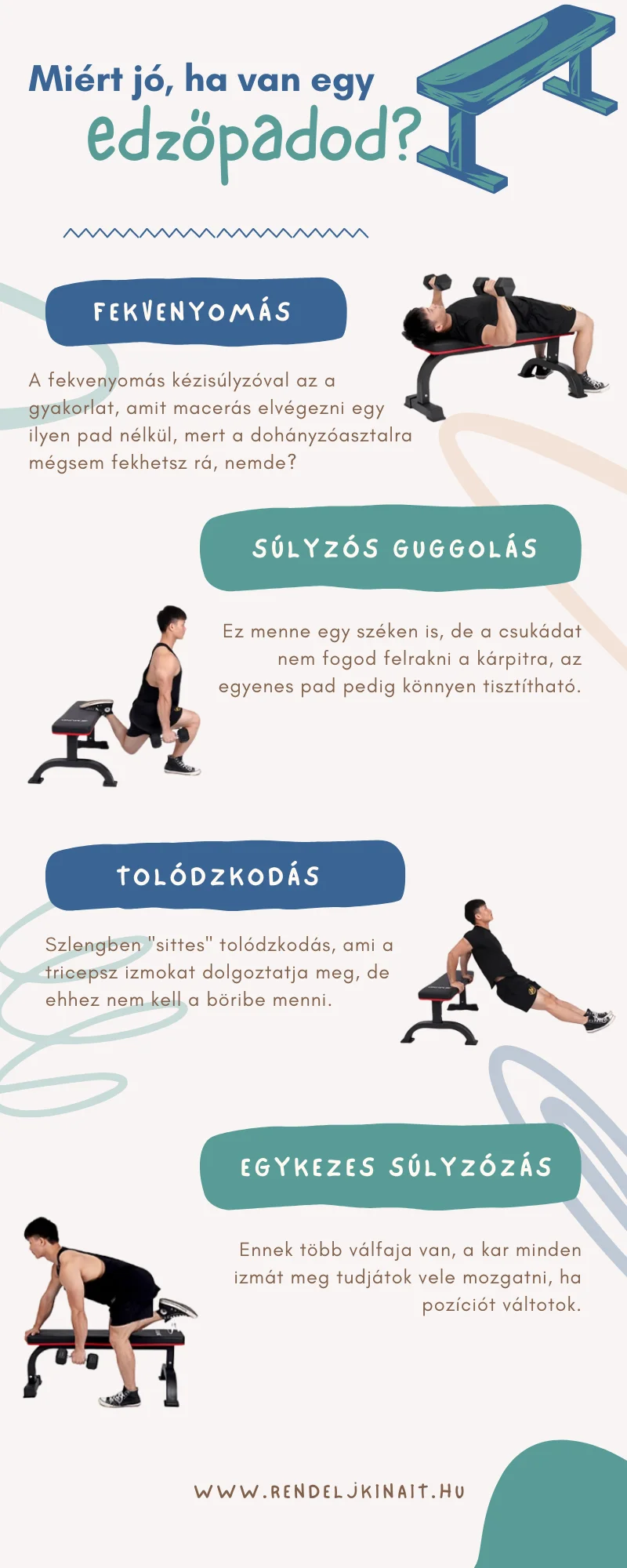 de a saját testsúlyosakhoz nem. Ezeket próbálgatom már néhány hete, és a pad bírja. Az viszont nem tetszik, hogy néha meg-megnyekken terhelés alatt, igaz elhajlást vagy sérülést nem vettem észre, szerintem csak a puha párna műbőr huzata adja ki a fura hangot, nem a szerkezet csavarodik, ami azért meg is lepne, mert 67 kiló vagyok. Összességében azt gondolom, hogyha ti nem élsportolók vagytok, akkor egy ilyen edzőeszköz évekig kiszolgál majd benneteket, de a minőség kapcsán nem szabad nagyot álmodnotok.