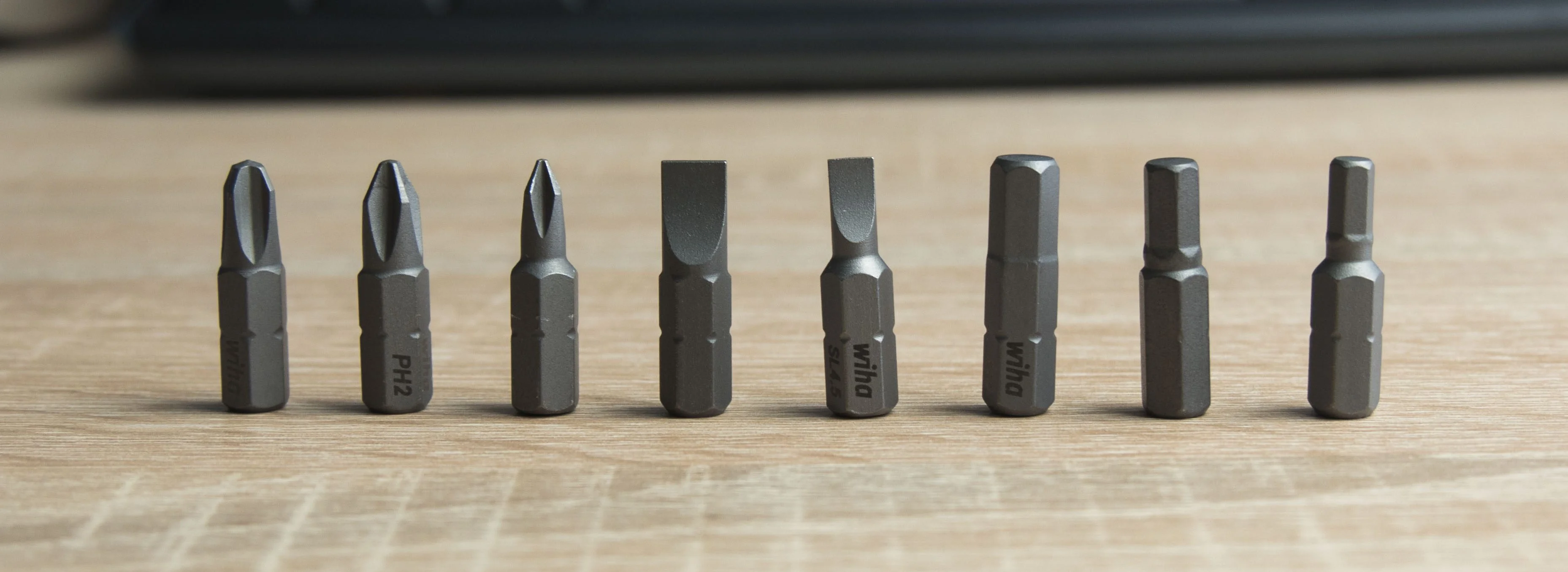 Ha ez nem lenne elég, szabadon kiegészíthetjük más bitekkel, mivel szabványos a foglalat. A bitek anyaga S2 szerszámacél, tehát semmi fancy, de csavarhúzási célra tökéletes mechanikai tulajdonságokkal rendelkezik. Tesztként megnyirbáltam velük pár nagyon szorosan behajtott csavart is, de semmi deformáció nem látszik rajtuk.