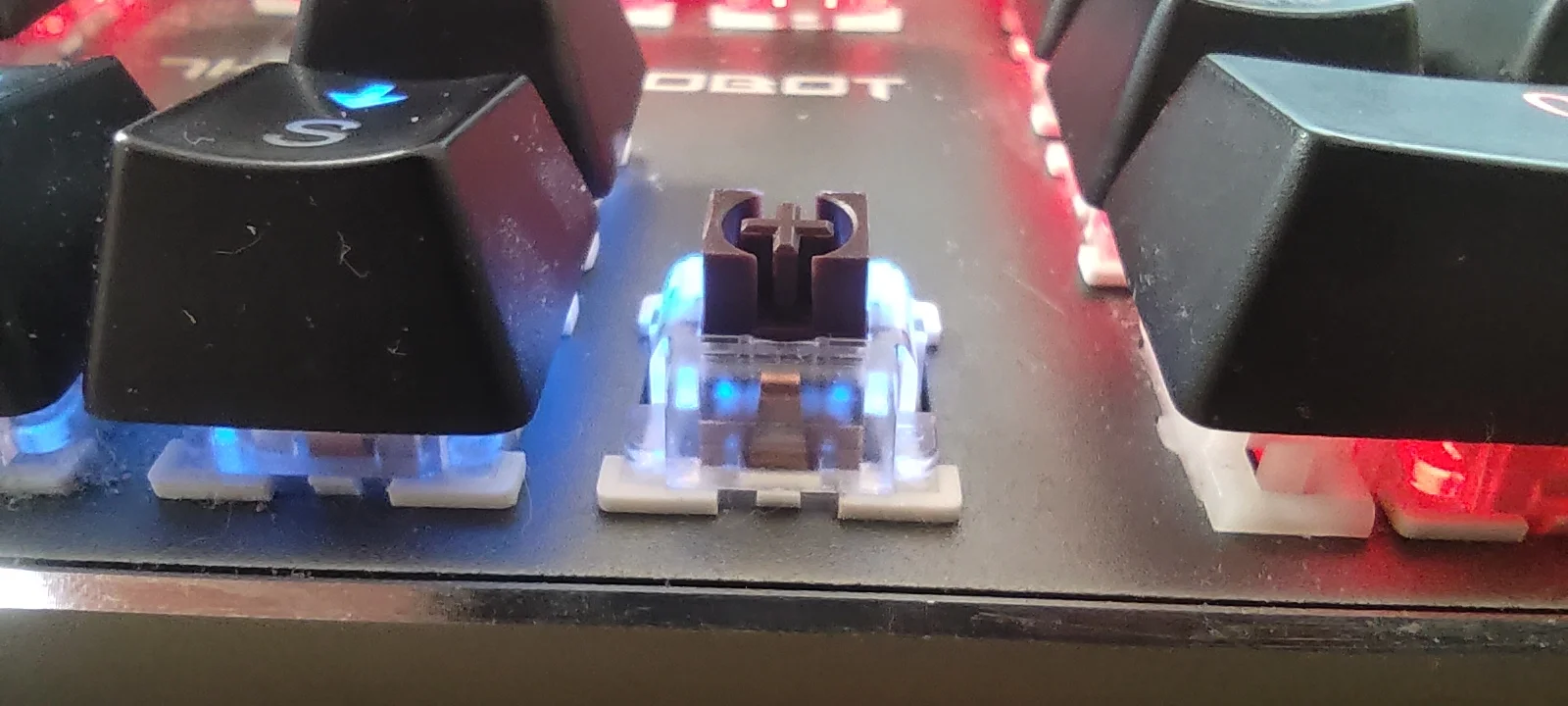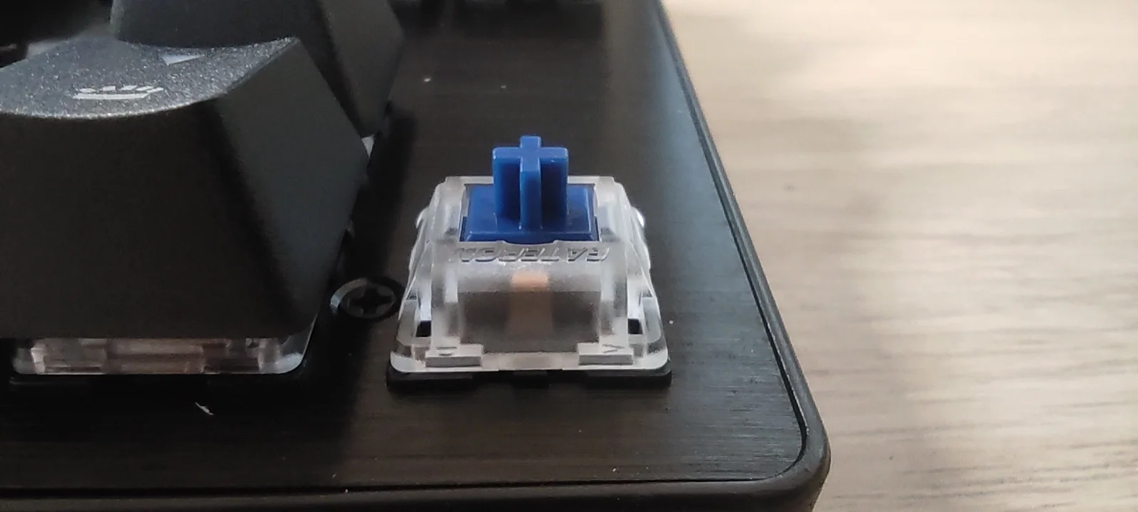Egyrészt van egy minimális ellenállása ezeknek a kék switch-eknek, amiket a Gateron szállít. Másrészt ez a „clicky” verzió, vagyis van egy pici kattanás lenyomáskor. Ez számomra kicsit retro feelinget áraszt, viszont remek lesz tőle az érzet, nemcsak érintés-, hanem hangalapú is az élmény. Csendesnek éppen nem nevezném – igazából iszonyatosan hangos –, de szeretem az ilyen klaviatúrákat munkára használni, viszont az éjszakai melót a család nem fogja annyira díjazni, szóval ne az ágyban csépeljetek rajta. Van azonban a KB2-ből zöld – ez még hangosabb és nehezebb lenyomni –, piros – ez halk és lineárisan jár – és sárga is, ami egy halkabb lineáris fajta, de még élőben ezt a verziót nem próbáltam soha.