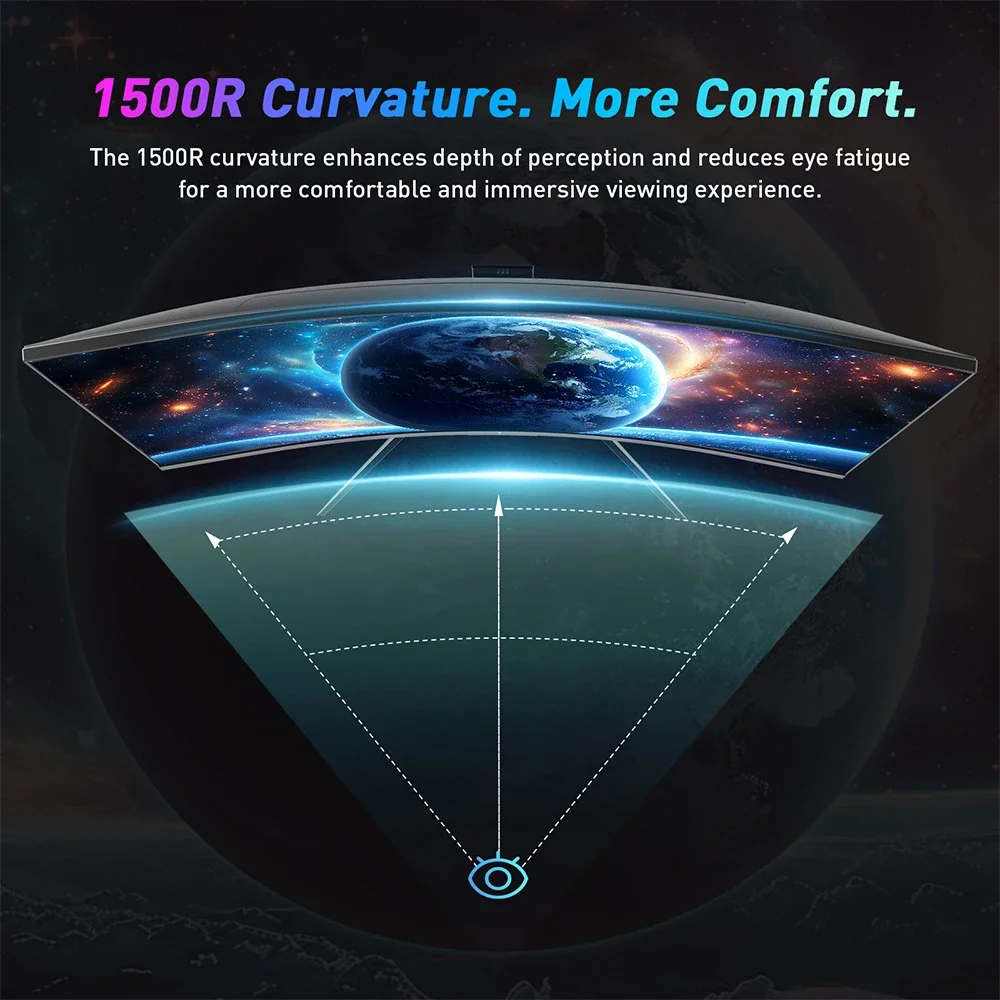 A KTC H32S17F a névrokonához hasonlóan szintén 32 colos képátlóval rendelkezik és 1500R görbületű. Az utóbbi annyit jelent, hogy egy 1500 milliméter sugarú kör körvonalára lehetne az adott monitor paneljének görbületét ráilleszteni. Ha egy monitor hajlított, akkor sokan egyből gamer monitorként könyvelik el, pedig ez a kinézetéből egyáltalán nem jön át.