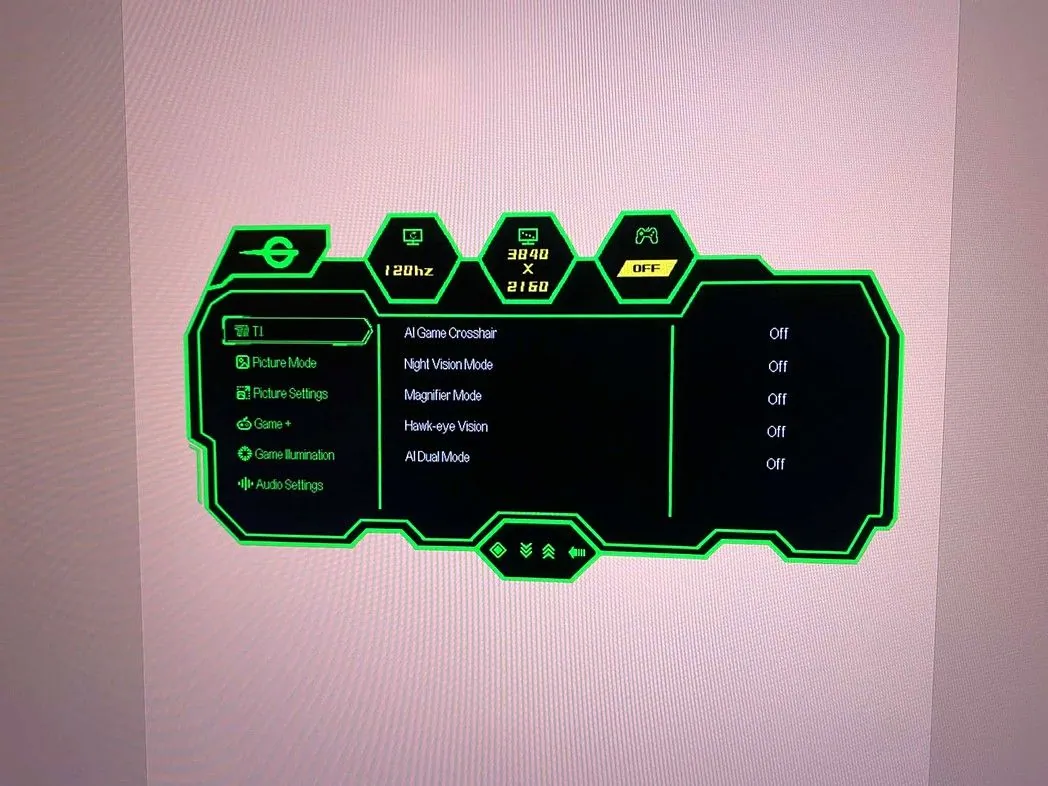 A monitor jobb alsó sarkánál 5 darab gombot találsz, amikkel a kijelző menüjében lehet matatni. Szokás szerint jobb lenne egy joystick, ugyanis csak két beállítási lehetőség van gyorsgombra kirakva: egyik a fényerő, ami már 50%-on is teljesen jó beszűrődő napfény mellett, ha dolgozol, ha játszol. A másik pedig az „AI Dual mode”, ami egy felbontáshoz és képfrissítési gyakorisághoz köthető, gyors beállítási opció, de erre picit lentebb kitérek.