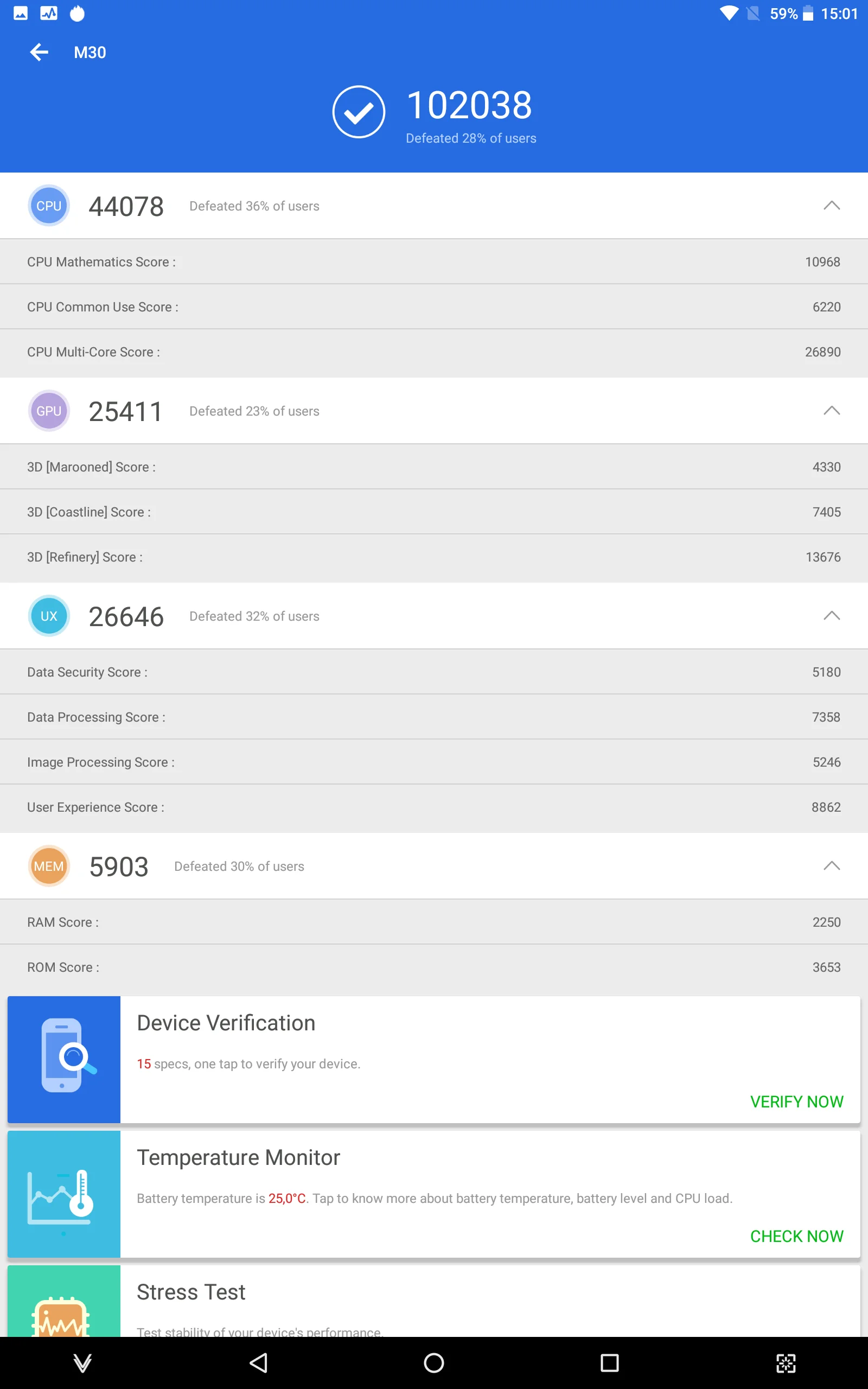 1-2 óra után már megszoktam, hogy vannak műveletek, amik lassúnak tűnnek és néha tényleg előfordulnak akadások, de közel sem olyan mértékűek, amik miatt pálcát kellene törni az M30 fölött. Az AnTuTu eredménye alapján egyébként korrekt teljesítményű a ketyere, 102 000 pontot sikerült összekaparnia. A GFXBench-en is jól teljesített, 1080p-ben 36 FPS-t ért el a T-Rex teszten. Természetesen a benchmarkok után kipróbáltam azt is, milyen rajta játszani, ha már ilyen eredményeket ért el.