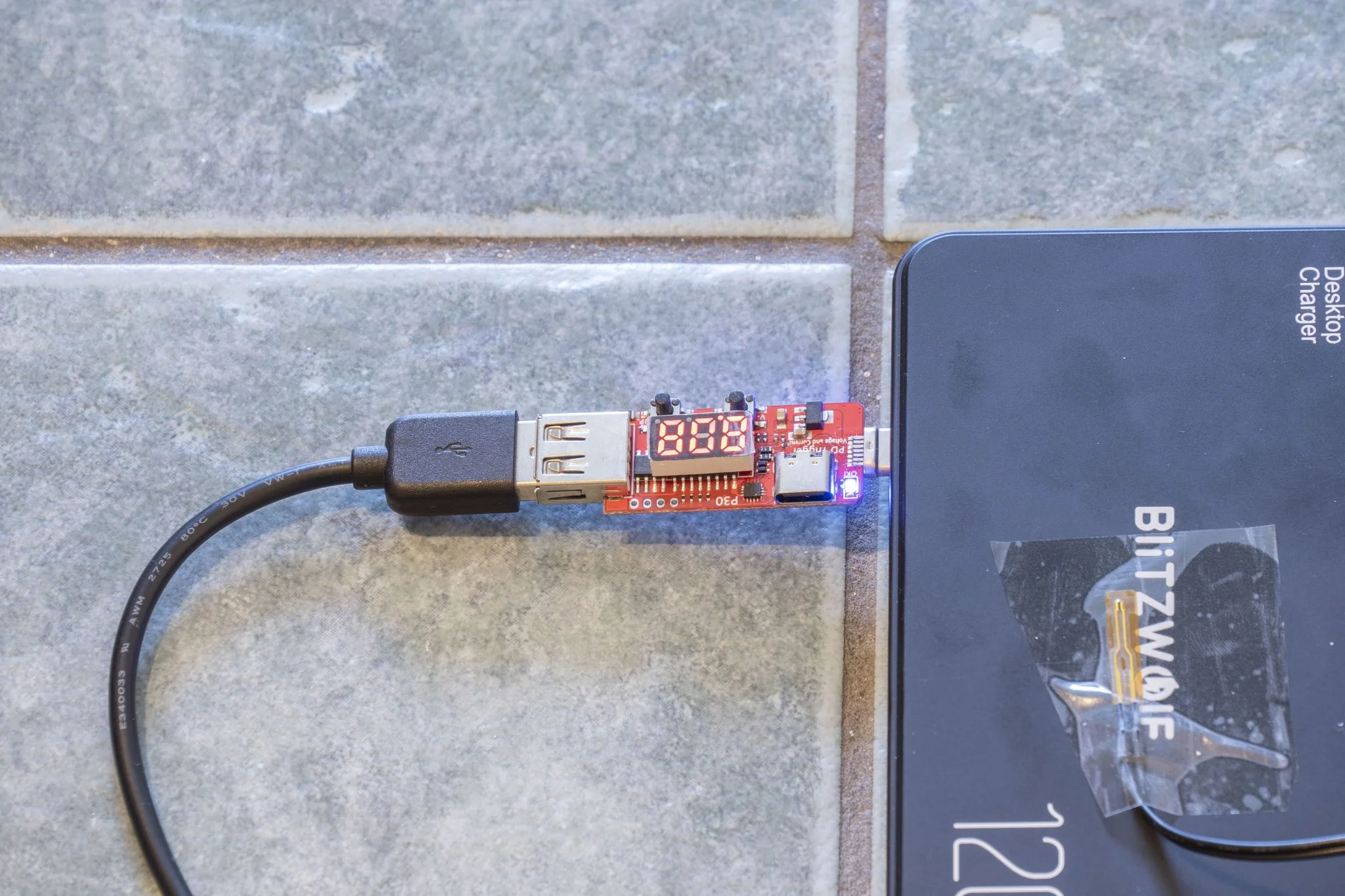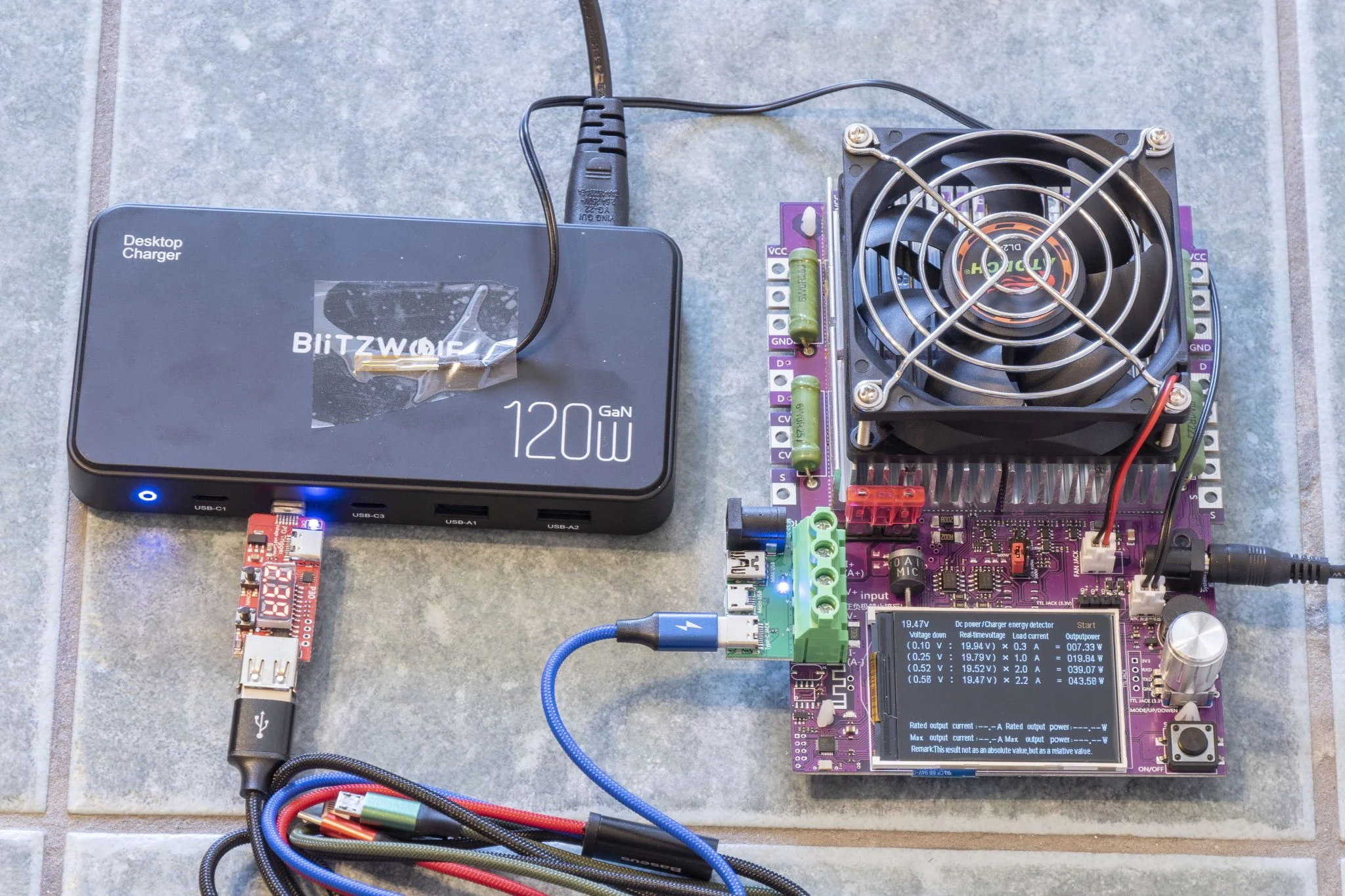 Így már tudtam provokálni a BlitzWolf BW-i100-at, viszont az eredmény csak részben bizonyította, hogy a töltő tudja, amit ígér. A Type-C porton keresztül 63 W-nál jobban nem tudtam megterhelni a töltőt, mert a kábelek nem tudták átvinni a teljesítmény. Ez nem azért van, mert nincs 100 watt teljesítményt elviselő kábelem, hanem azért, mert a PD trigger elektronika bemenete USB-A, és nem volt olyan kábelem, ami Type-C-to-USB-A kombinációban is tudta volna a 100 W-os teljesítmény. Ez nem véletlen, hiszen jellemzően Type-C-to-Type-C-vel visznek át ennyi energiát. Próbálkoztam átalakítókkal, azokkal viszont meg a PD protokoll nem ment, így feladtam a küszködést.