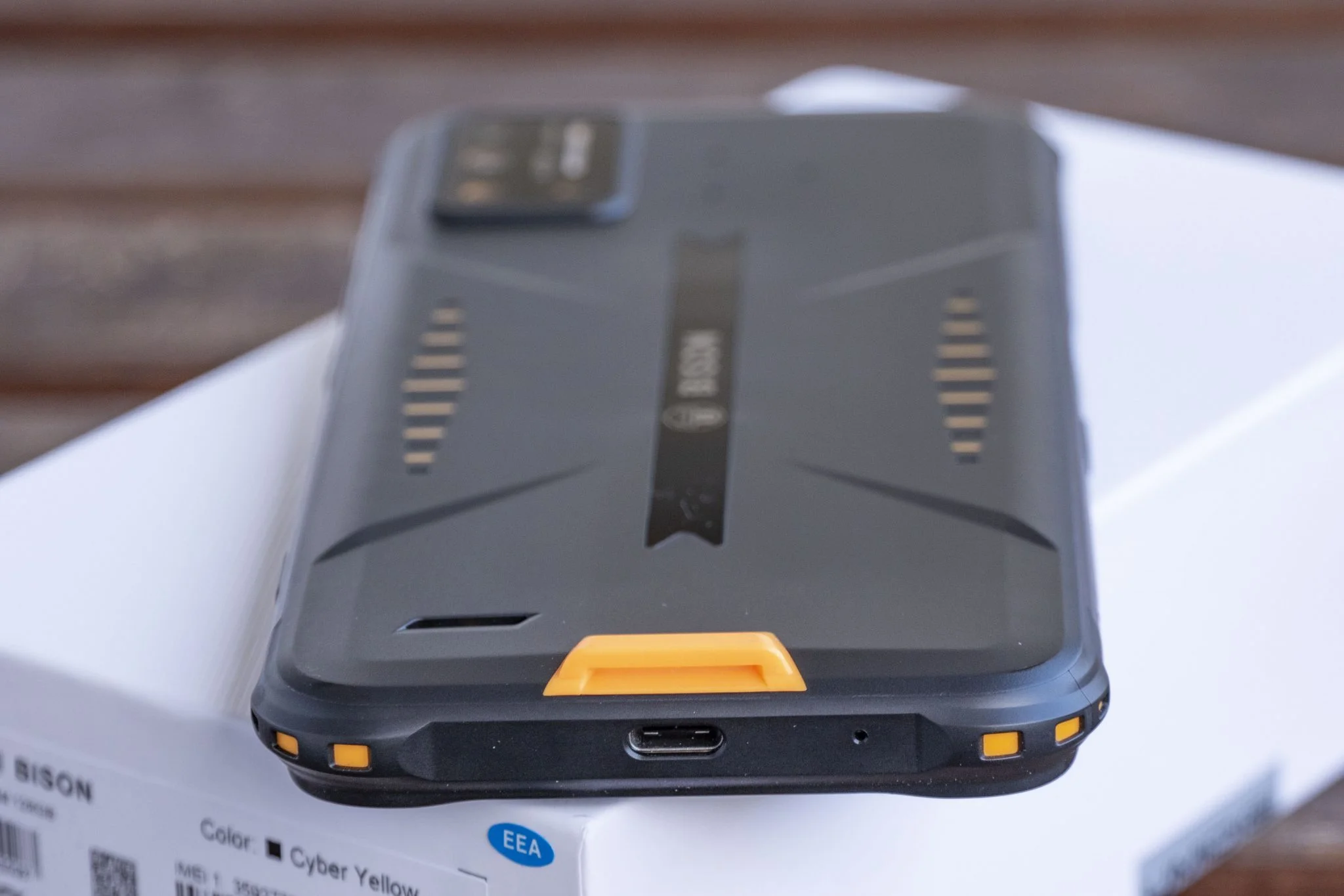 De most koncentráljunk az Umidigi Bisonra, mert szerintem eltalálták a kinézetét. Nem mondom, hogy Schwarzenegger is ezt venné a Hummer mellé, de nem ízléstelen, mint néhány versenytársa. Masszív, fekete monolit tömb, amit helyenként sárga betétek – cyber yellow a neve, de van lava orange-ban is – törnek meg, a négyelemű kamerát is sikerült a kinézet integráns részévé tenni. A sarkokat narancs színű műanyag betétekkel erősítették meg, illetve vicces dizájnelem a csuklópánt felfogató füle, a hátlap alján. A bal élén bújik meg az ujjlenyomat-olvasó, amit így a bal kezem hüvelyujjára kalibráltam be, alapvetően jól működik ez a megoldás is.